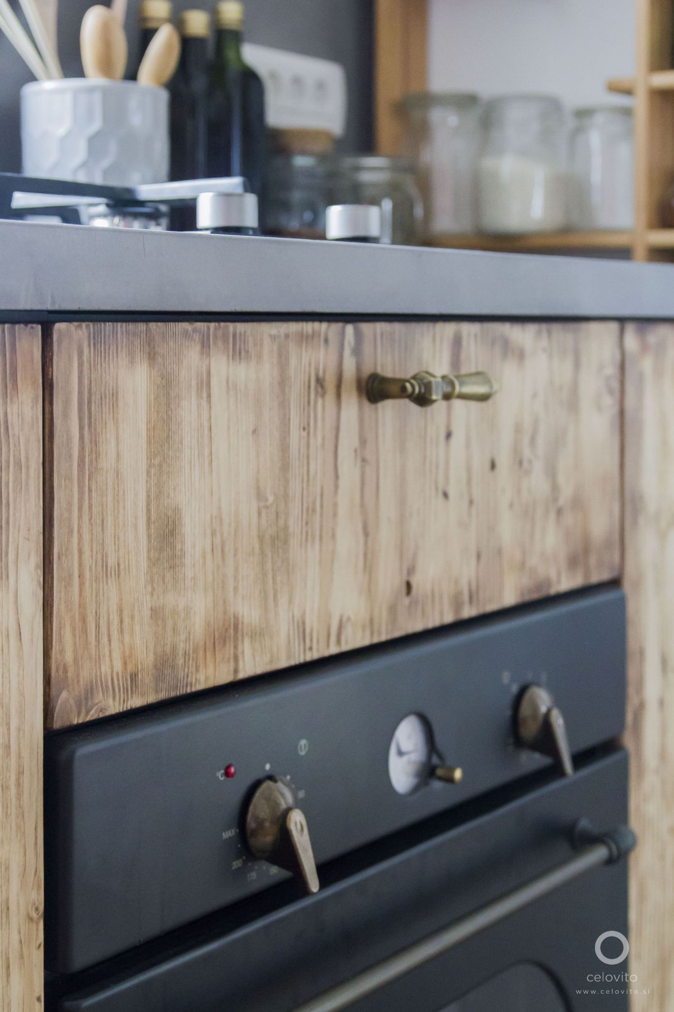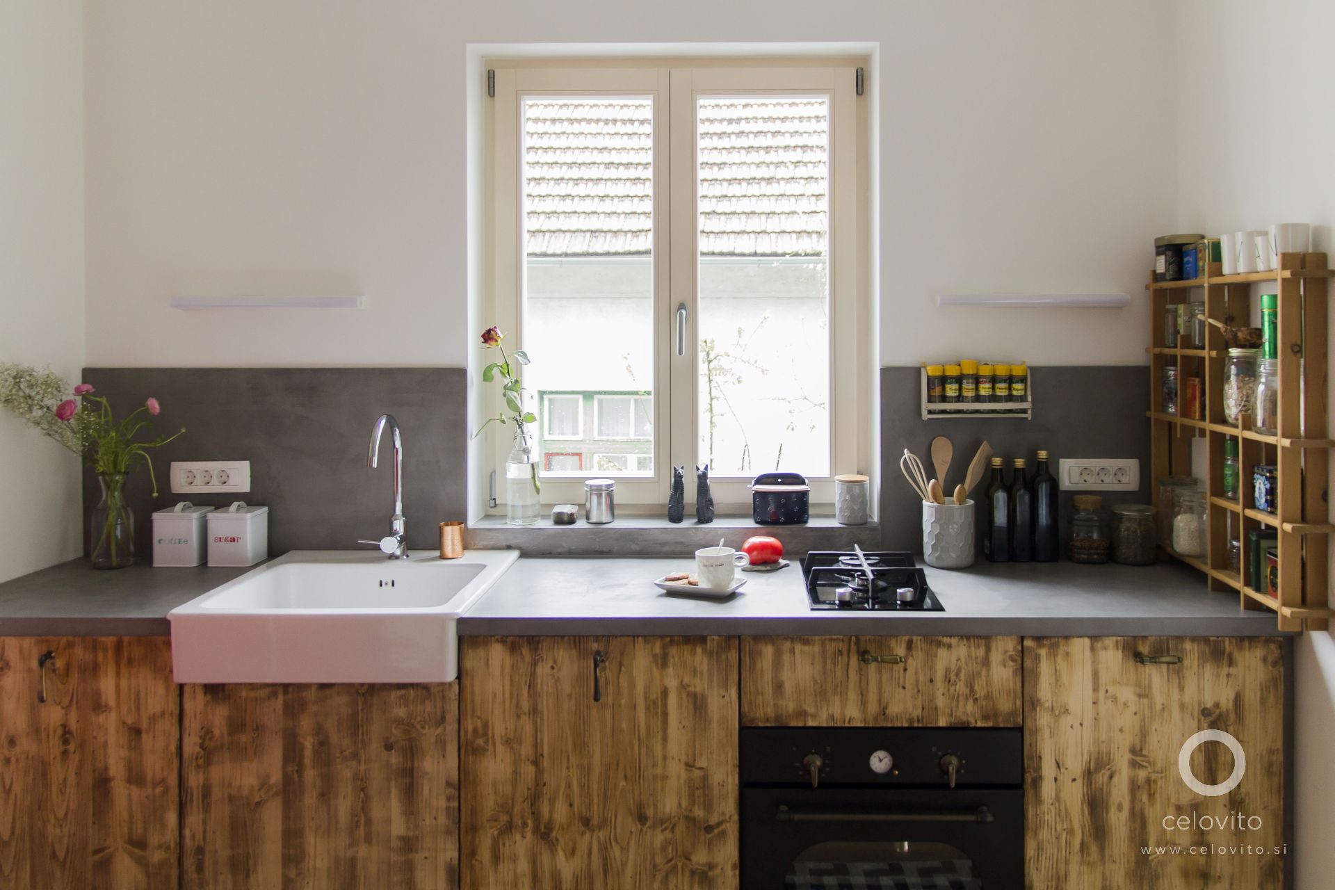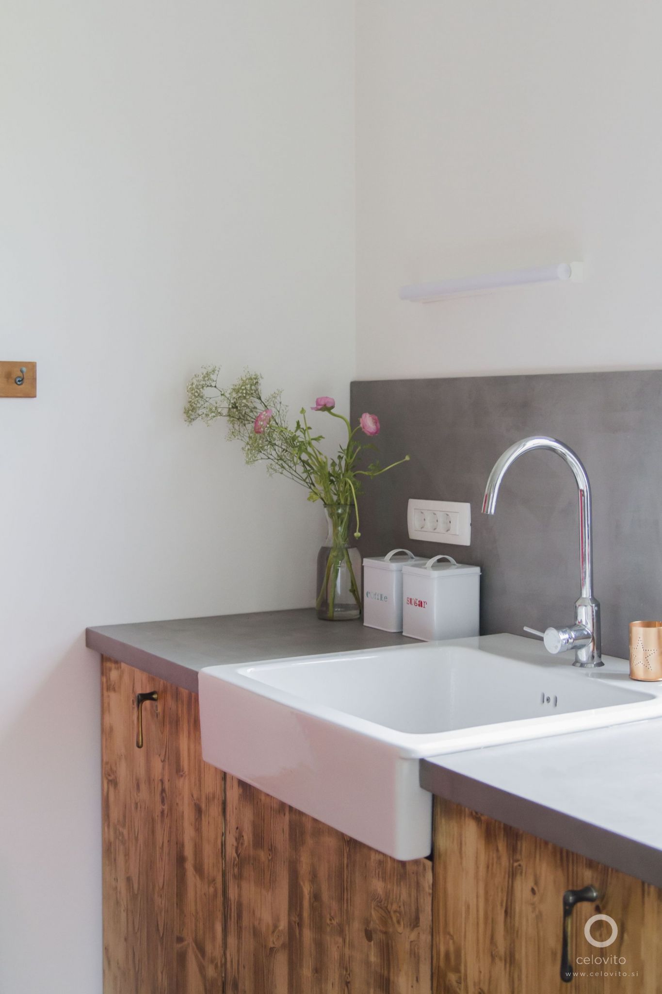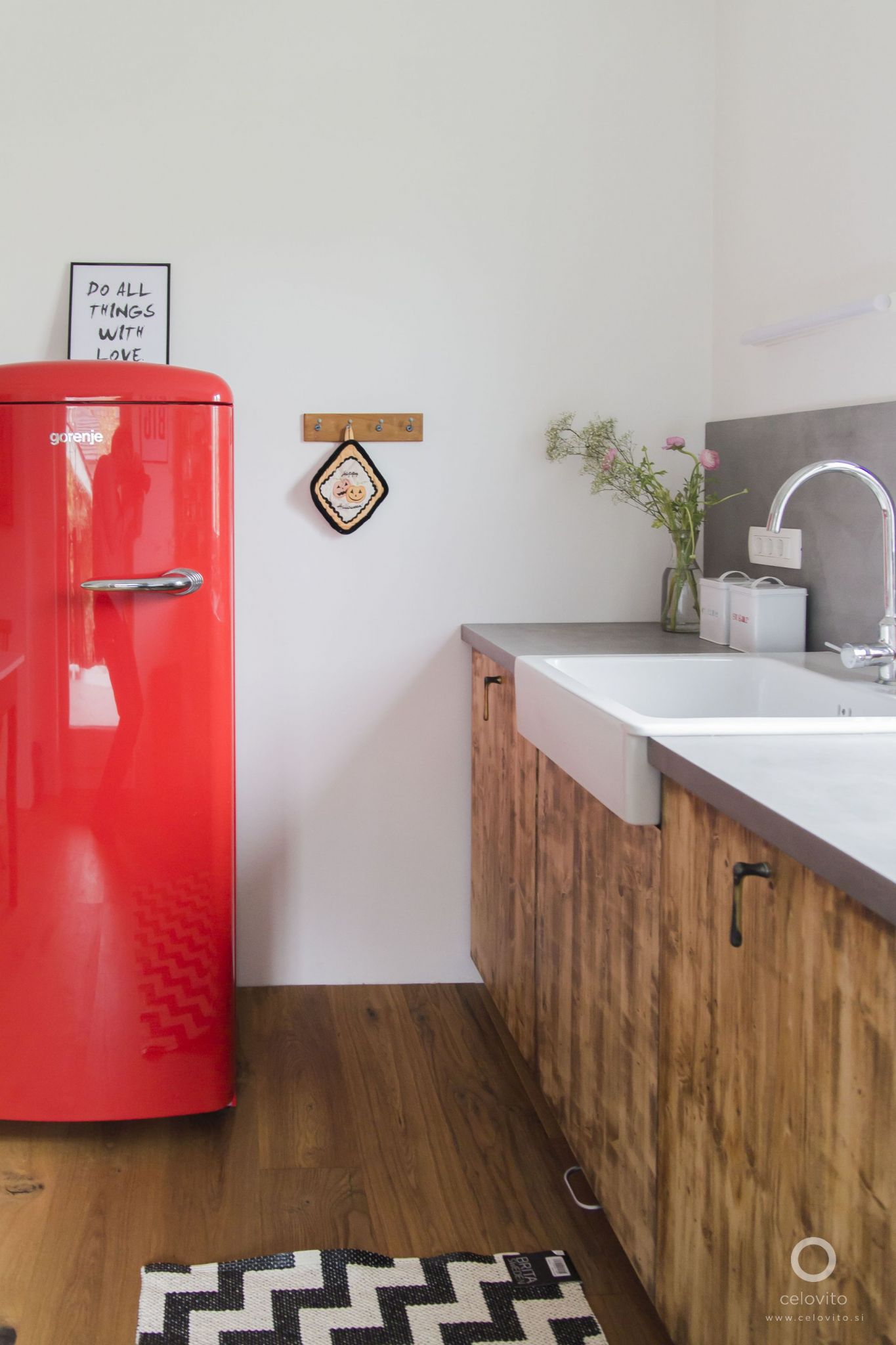 Kuhinja je nadvse šarmantna prav zaradi kombinacije materialov in tekstur. Betonski pult se odlično sklada z lesenimi, rahlo patiniranimi kuhinjskimi frontami, na katere smo pritrdili stare kljuke iz oken in vrat, ki smo jih shranili še pred pričetkom del. Betonski pult se dviguje še do višine ki jo ima običajno obloga kuhinjskih sten, vendar tukaj, na željo lastnika, prostor nismo zapirali z visečimi omaricami. Rdeč samostoječ hladilnik v retro slogu zato še toliko bolj izstopa in opozarja nase.