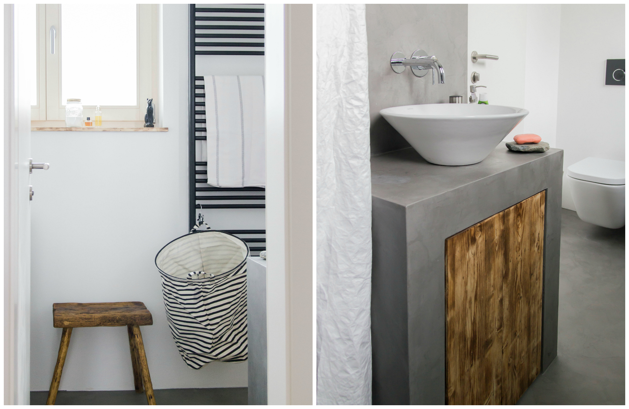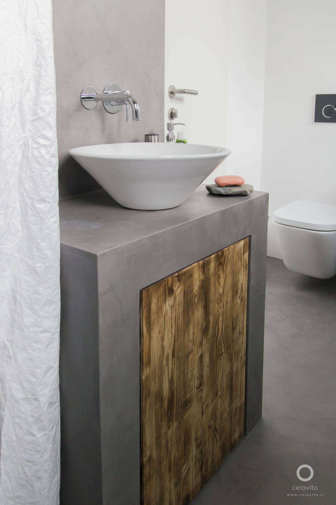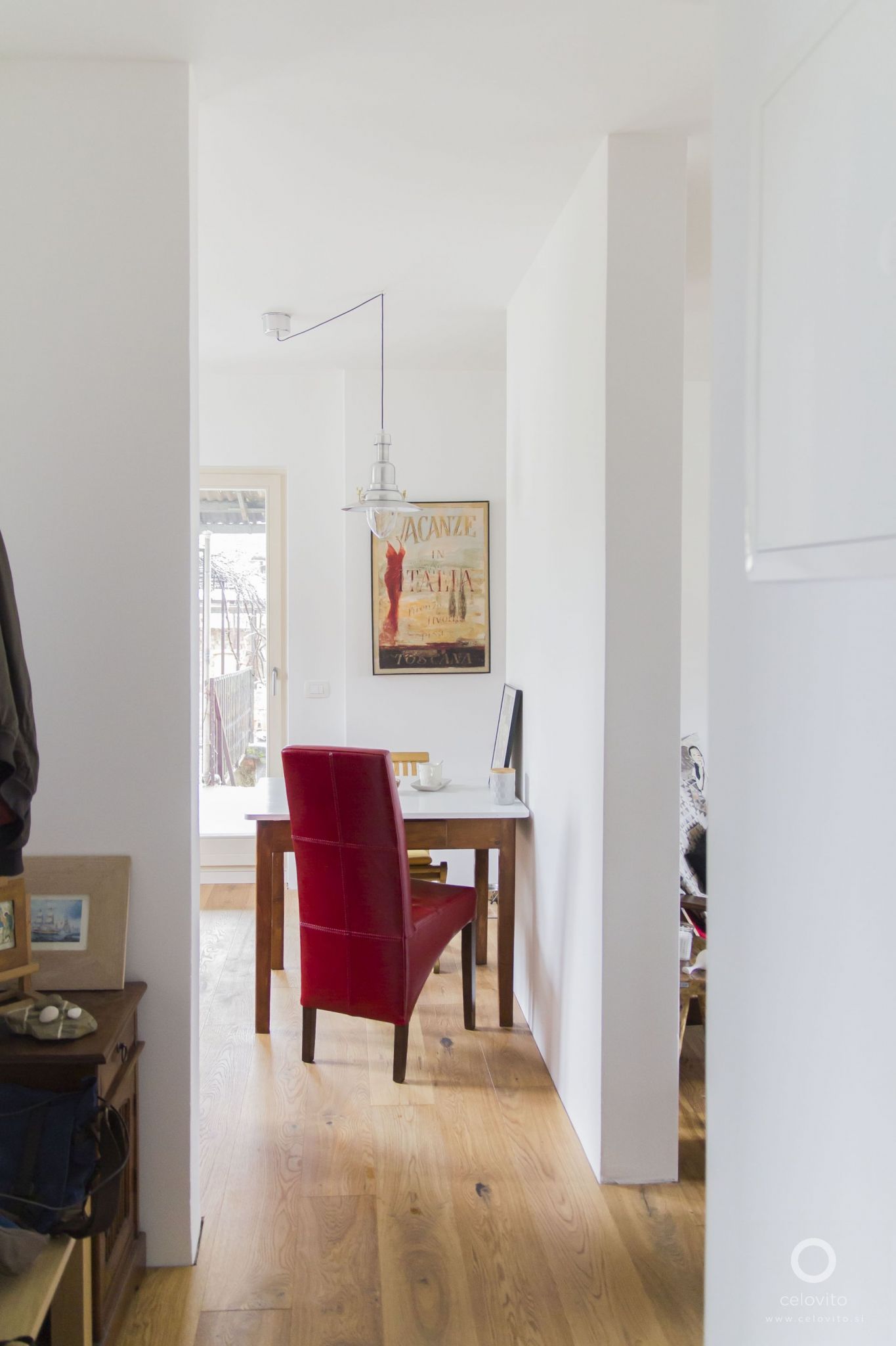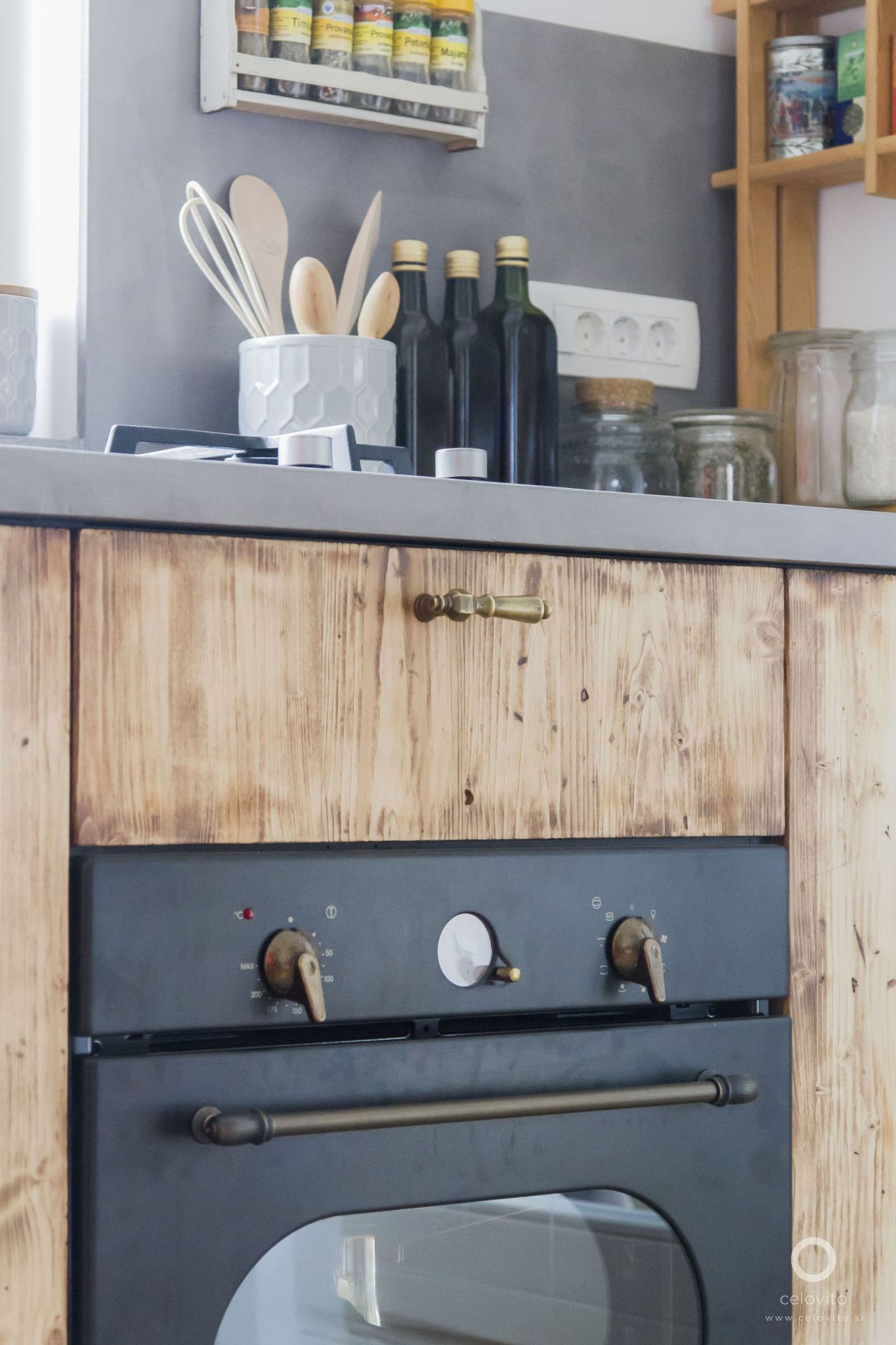 Kuhinja je nadvse šarmantna prav zaradi kombinacije materialov in tekstur. Betonski pult se odlično sklada z lesenimi, rahlo patiniranimi kuhinjskimi frontami, na katere smo pritrdili stare kljuke iz oken in vrat, ki smo jih shranili še pred pričetkom del. Betonski pult se dviguje še do višine ki jo ima običajno obloga kuhinjskih sten, vendar tukaj, na željo lastnika, prostor nismo zapirali z visečimi omaricami. Rdeč samostoječ hladilnik v retro slogu zato še toliko bolj izstopa in opozarja nase.