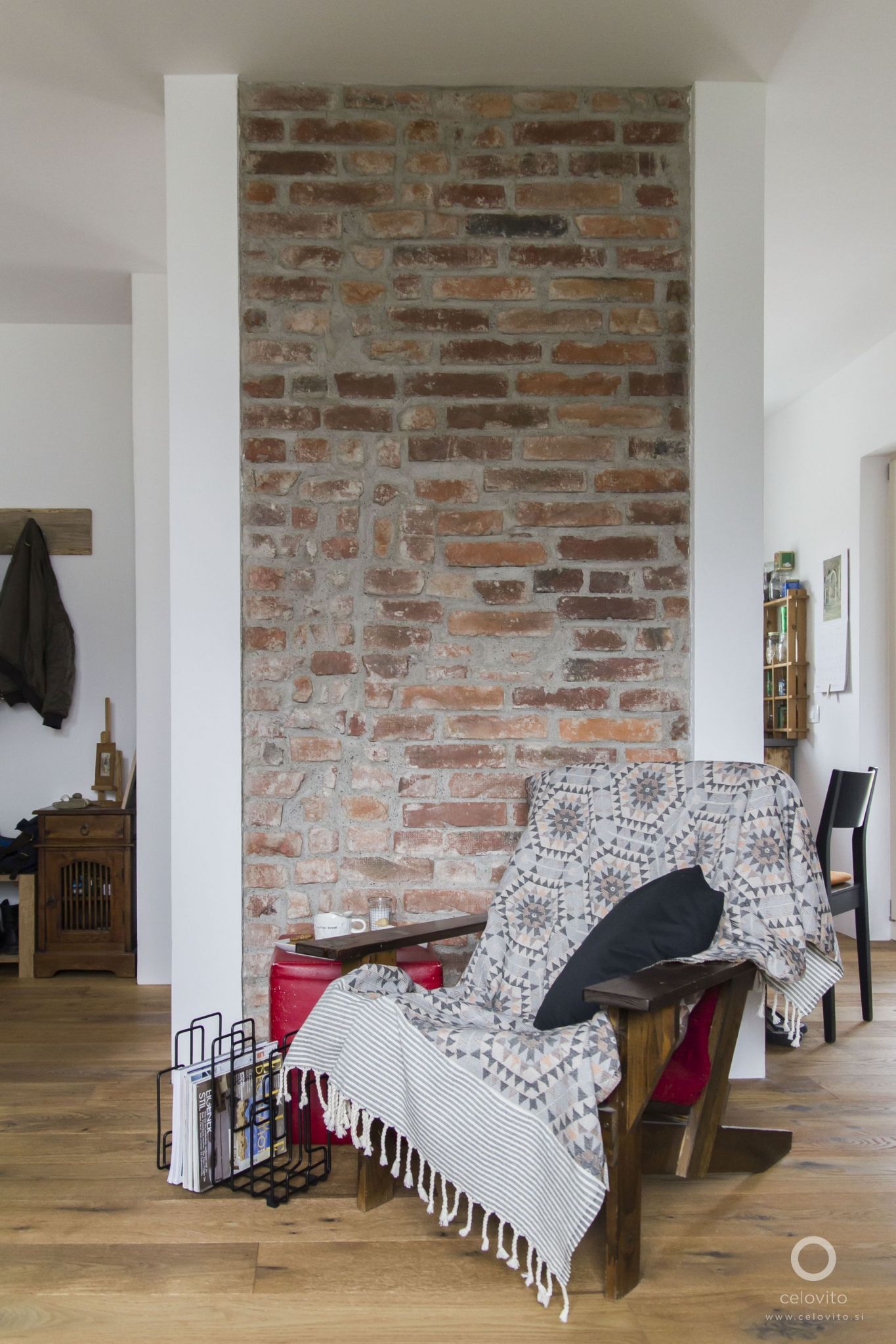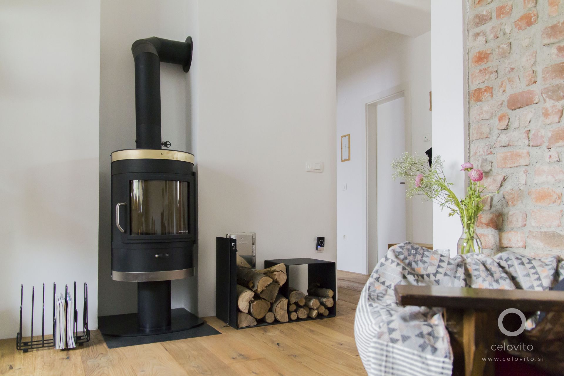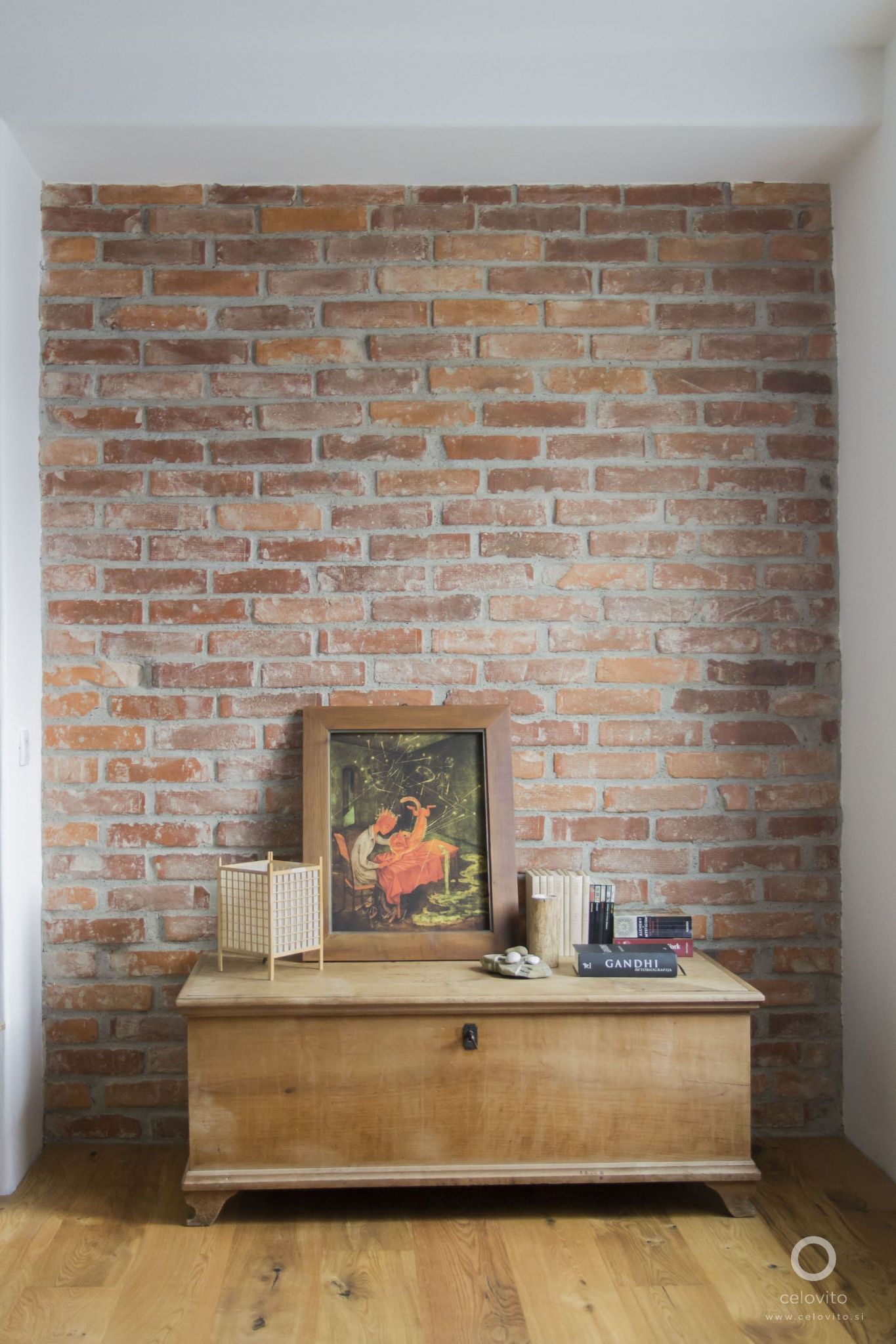 Po temeljitem pogovoru smo se odločili, da ustvarimo stanovanje, ki bo na primeren način izražalo svojo zgodovino in se prepletalo z zgodbo lastnika. Potrebno je bilo porušiti nekaj sten, tako da smo prostore odprli in jih med seboj povezali. Majhni temačni prostori so se tako preobrazili v čudovit, svetel in odprt dom. V osrednjem dnevnem prostoru ima glavno vlogo čudovita opečnata stena, ki smo jo ohranili kot vez med starim in novim. Nasproti nje je kamninska peč na drva, ki pozimi pričara domačnost, toploto in prijeten vonj po lesu.