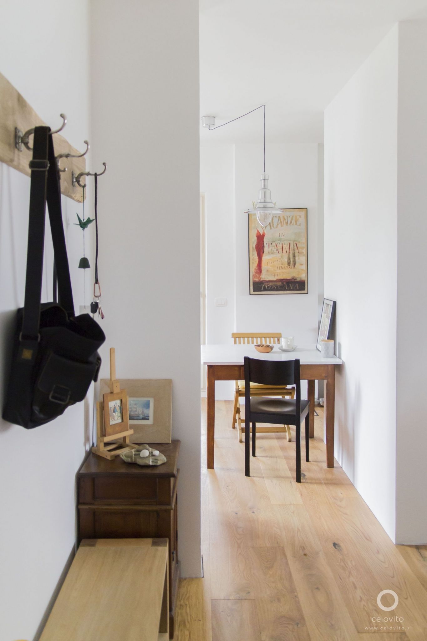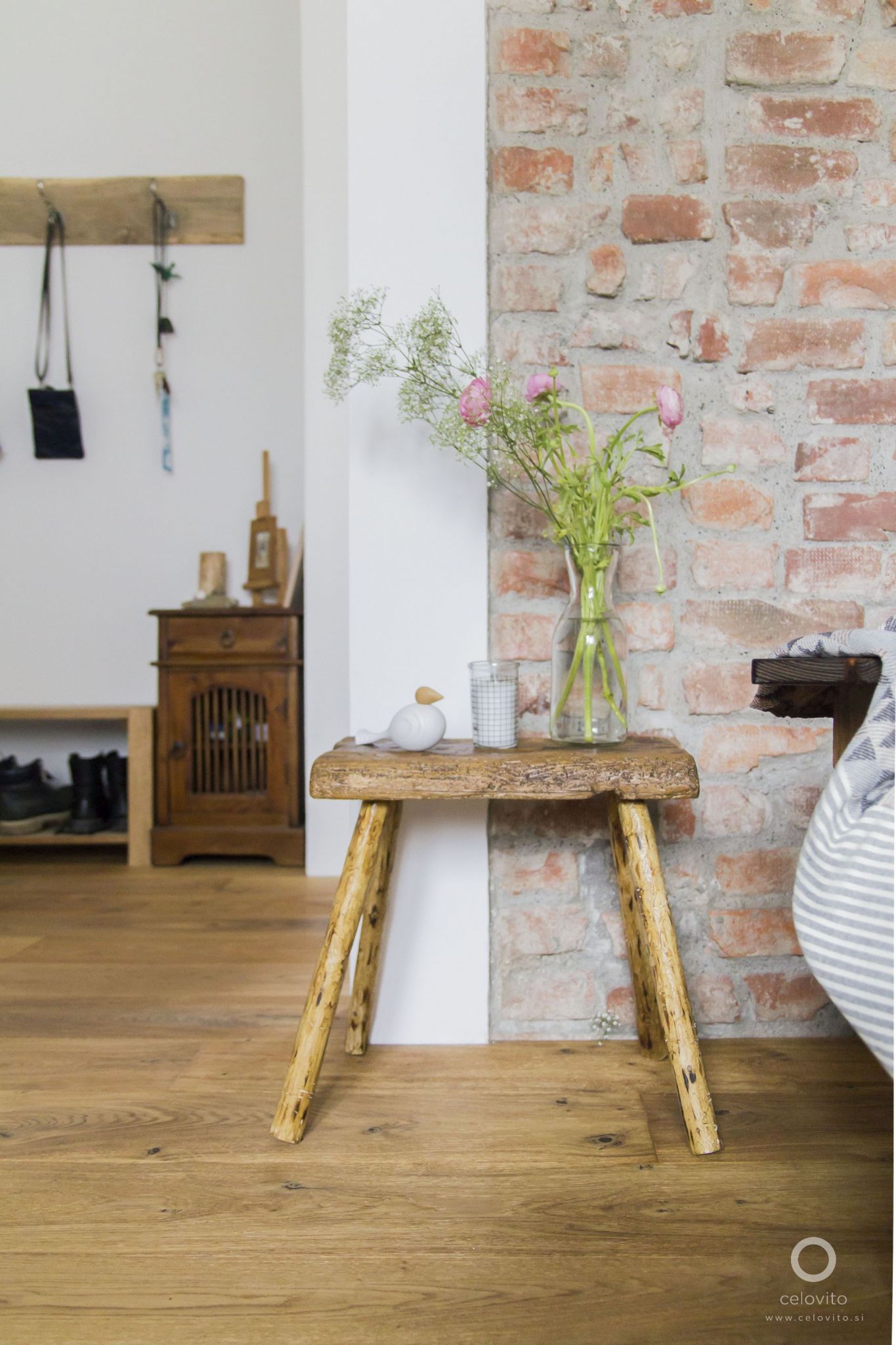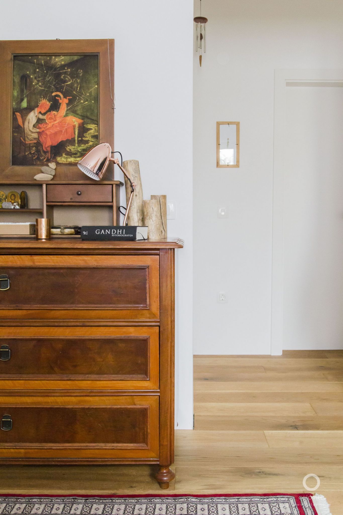 Prav poseben čar pa stanovanju vdihujejo stari, od babice podedovani kosi pohištva. Velik predalnik, lesena skrinja, stari foteljčki z lesenimi rokonasloni in še drugi manjši kosi s patino se lepo prepletajo s svežino belih sten in toplino oljenega tlaka.