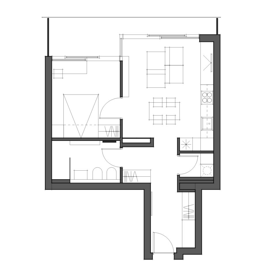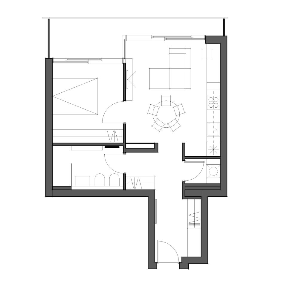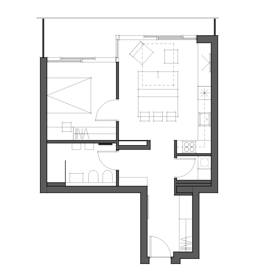 Prva varianta predvideva kuhinjo ob vzdolžni steni, z vogalnim elementom. Jedilnica in dnevna soba sta povezani z elementom, ki je na eni strani uporaben kot kavč, na drugi pa kot klop ob jedilni mizi. Kavč se lahko po potrebi predela v ležišče. Spalnica je organizirana podobno kot v prodajnem tlorisu, dodali smo le manjši delovni kotiček. V kopalnici sta predvideni dve omarici na steni z radiatorjem. V hodniku pred kopalnico predlagamo namestitev dodatne omarice. Desno od vhodnih vrat predlagamo garderobno omaro in sedišče z obešalniki, na steni nasproti pa veliko ogledalo. Za maksimalno izkoriščenost majhnega utilityja predlagamo postavitev omar nad in ob kombiniran pralno-sušilni stroj.
