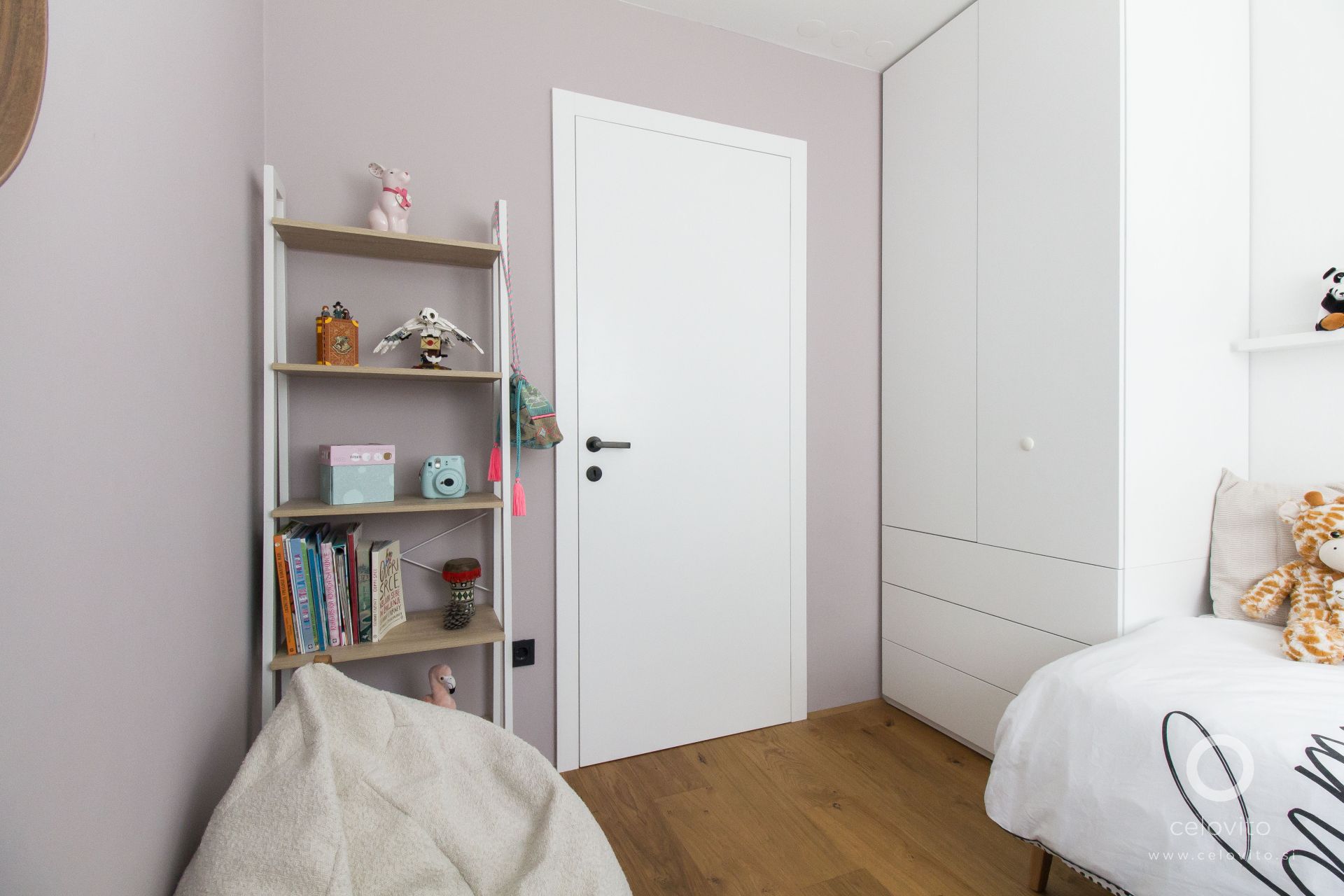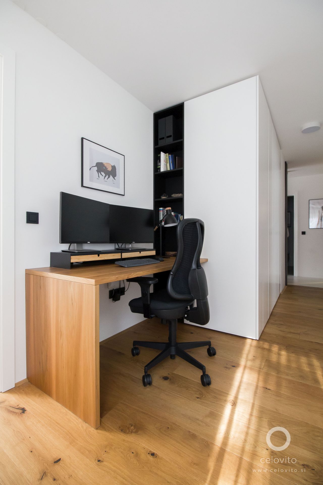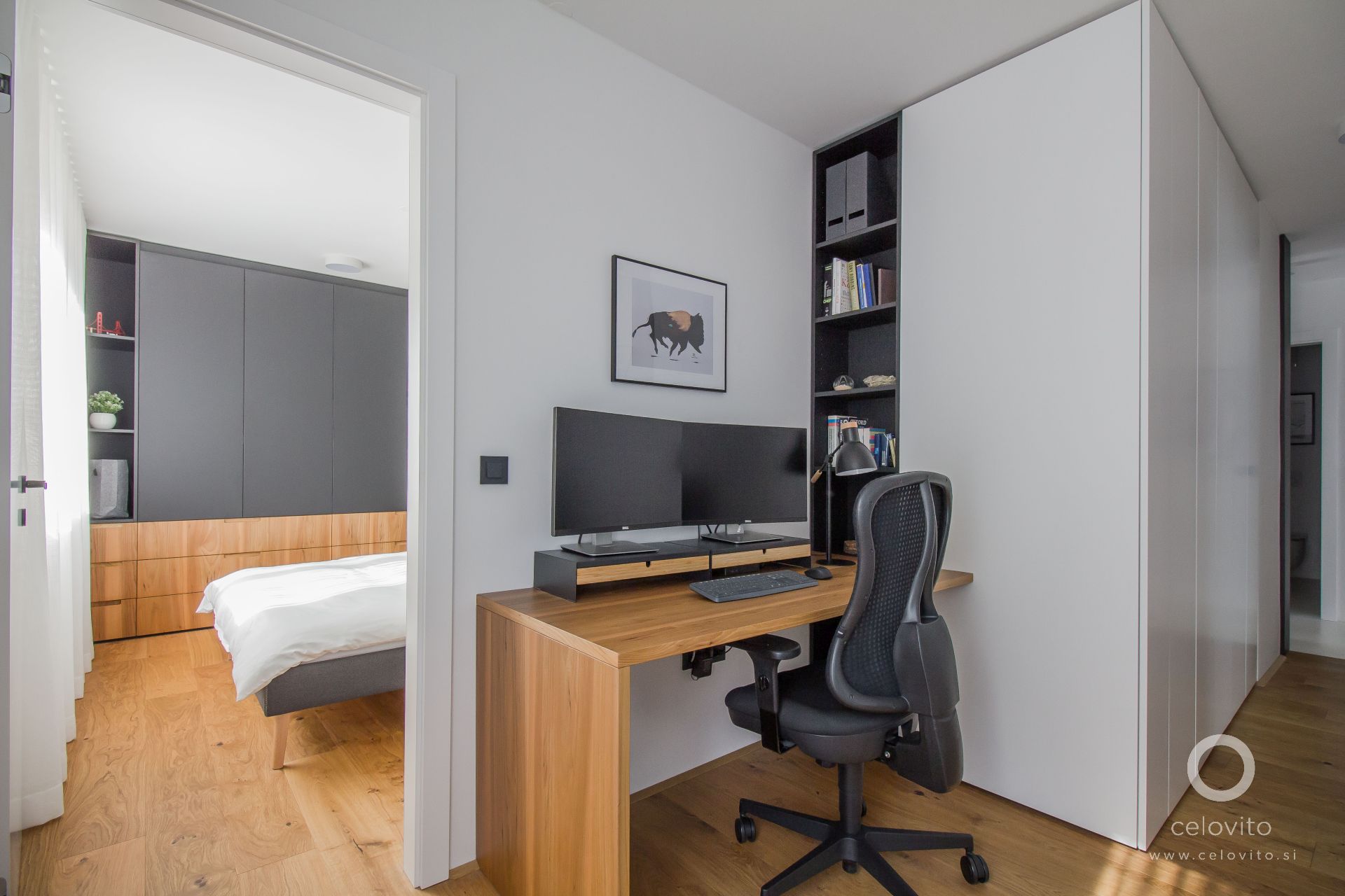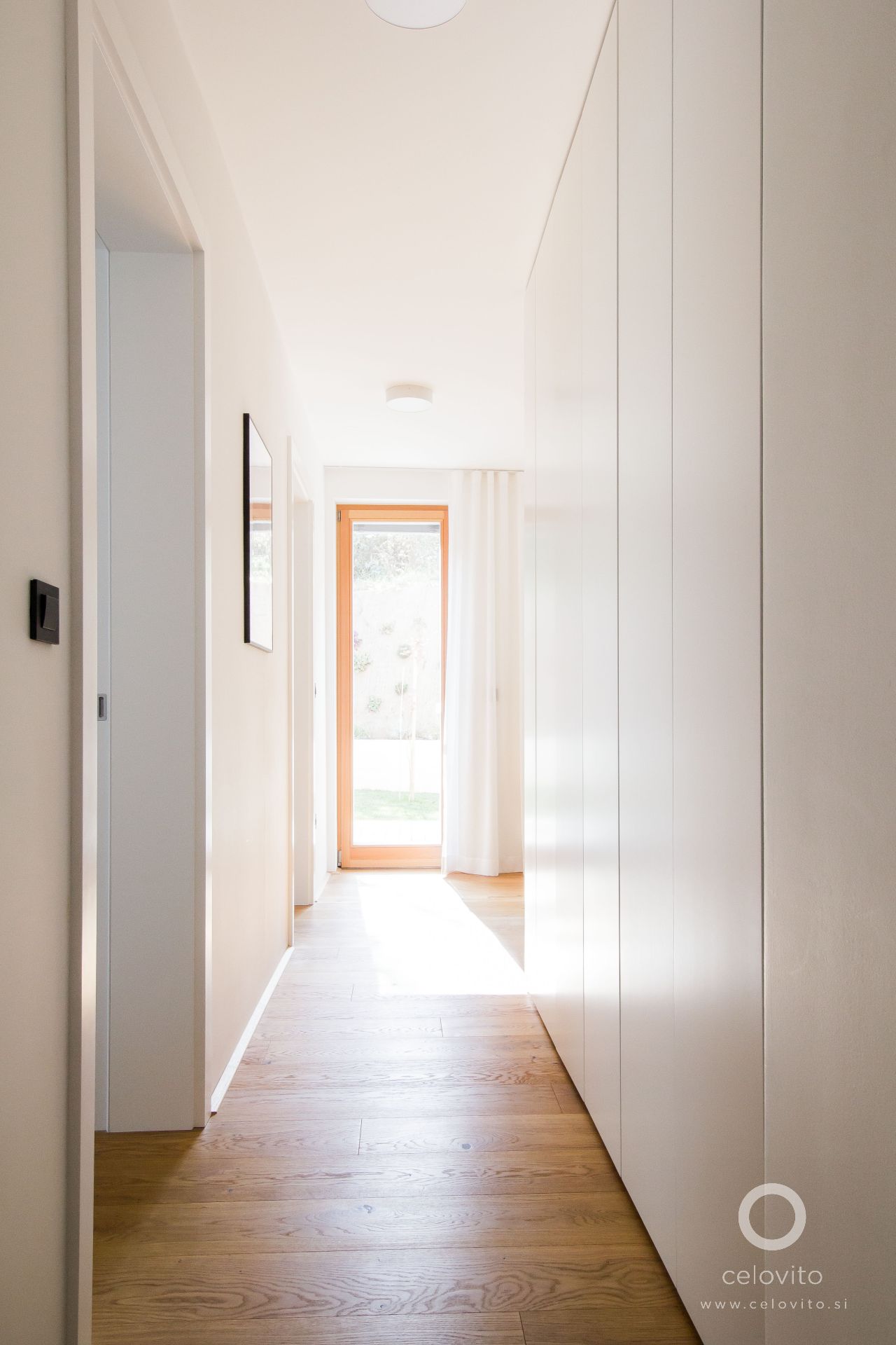 Pri preureditvi prostorov sta poskrbela za optimalno izrabo prostora tudi pri prehodu iz dnevnega v spalni del. Prestavila sta predelno steno med hodnikom in dnevno sobo, kar je omogočilo maksimalno izrabo prostora. Vzdolž hodnika je vgrajen niz omar, ki nudi dragocene dodatne shranjevalne površine in udoben kotiček za občasno delo od doma.