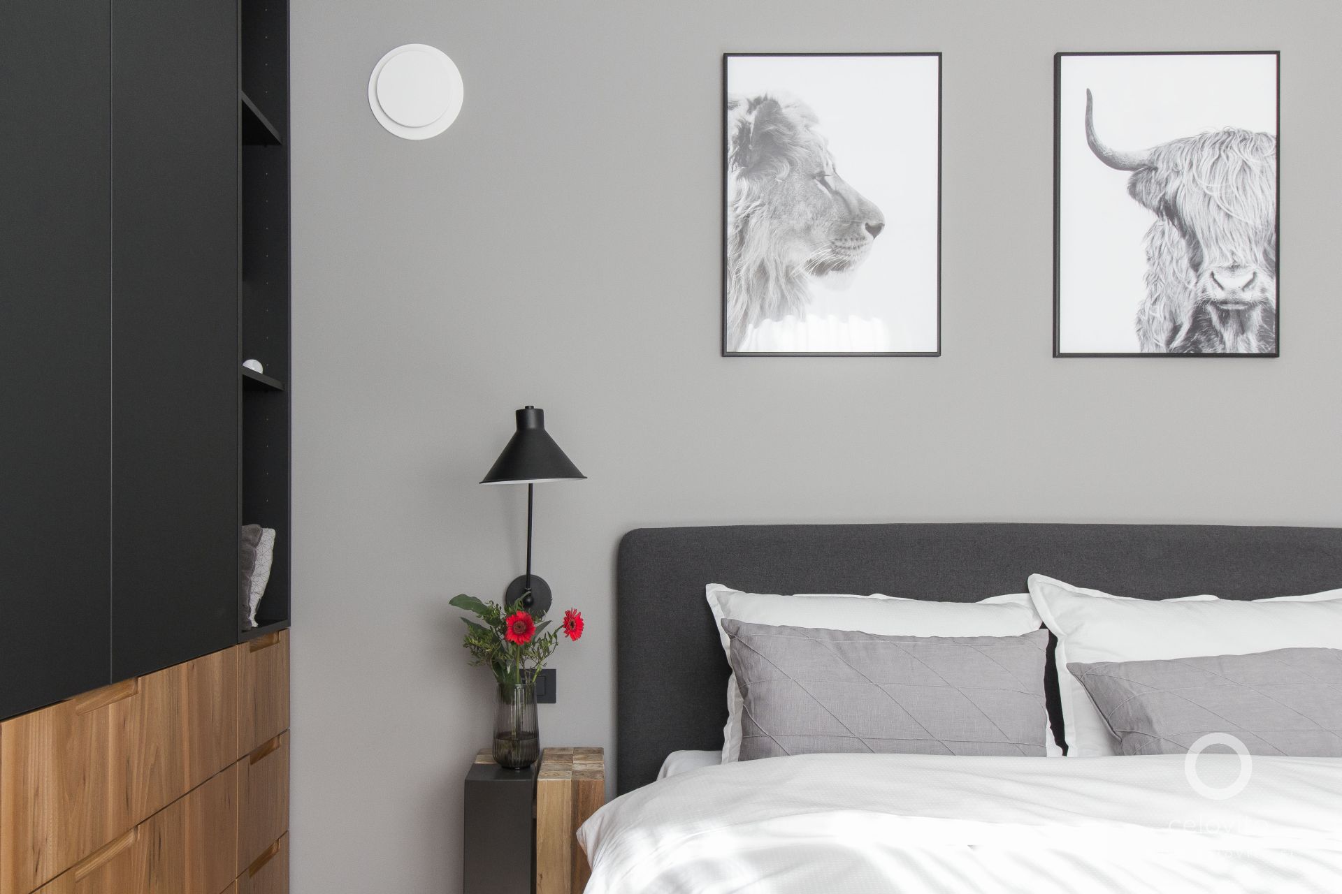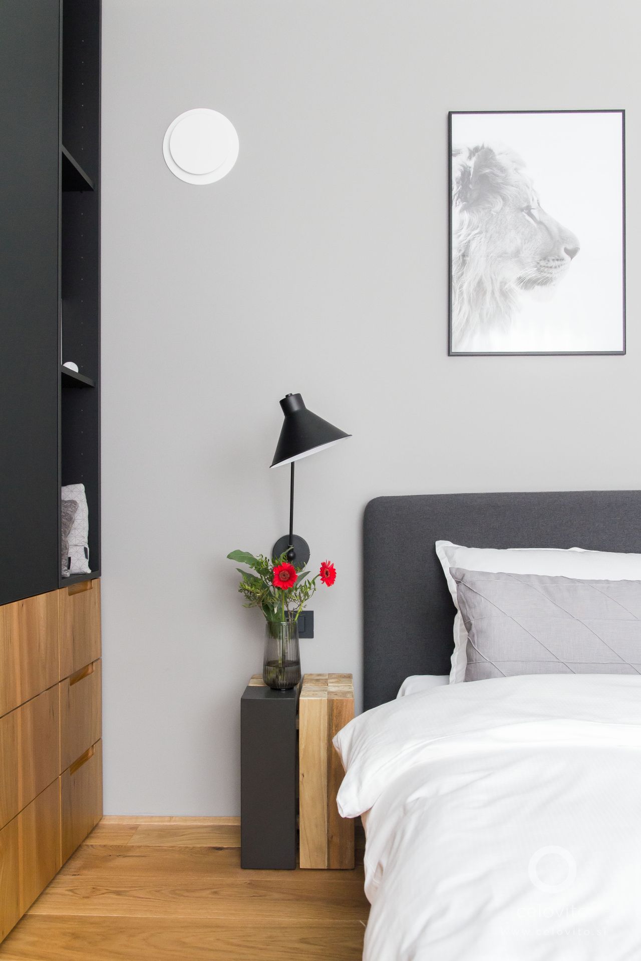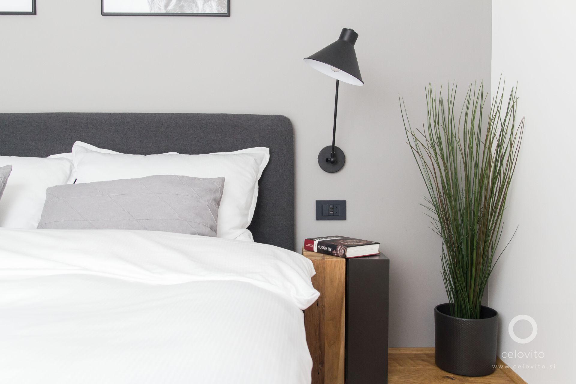 V spalnici sta s subtilnimi toni ustvarila umirjen prostor za počitek. Med barvami prevladujejo različni odtenki od bele do črne, ki prispevajo k monokromatski kombinaciji prostora. Leseni elementi, kot so parket in omare, dodajajo toplino in uravnotežijo barvno shemo.