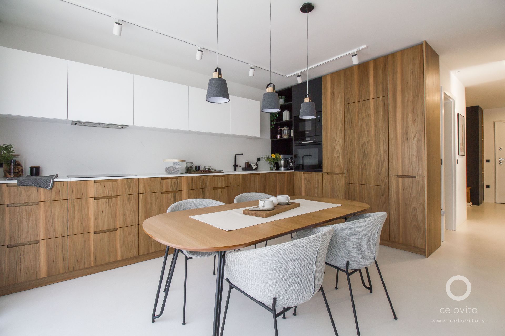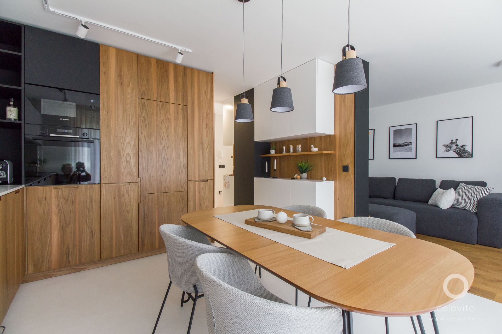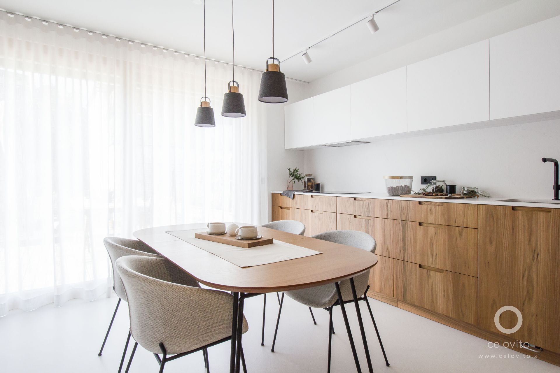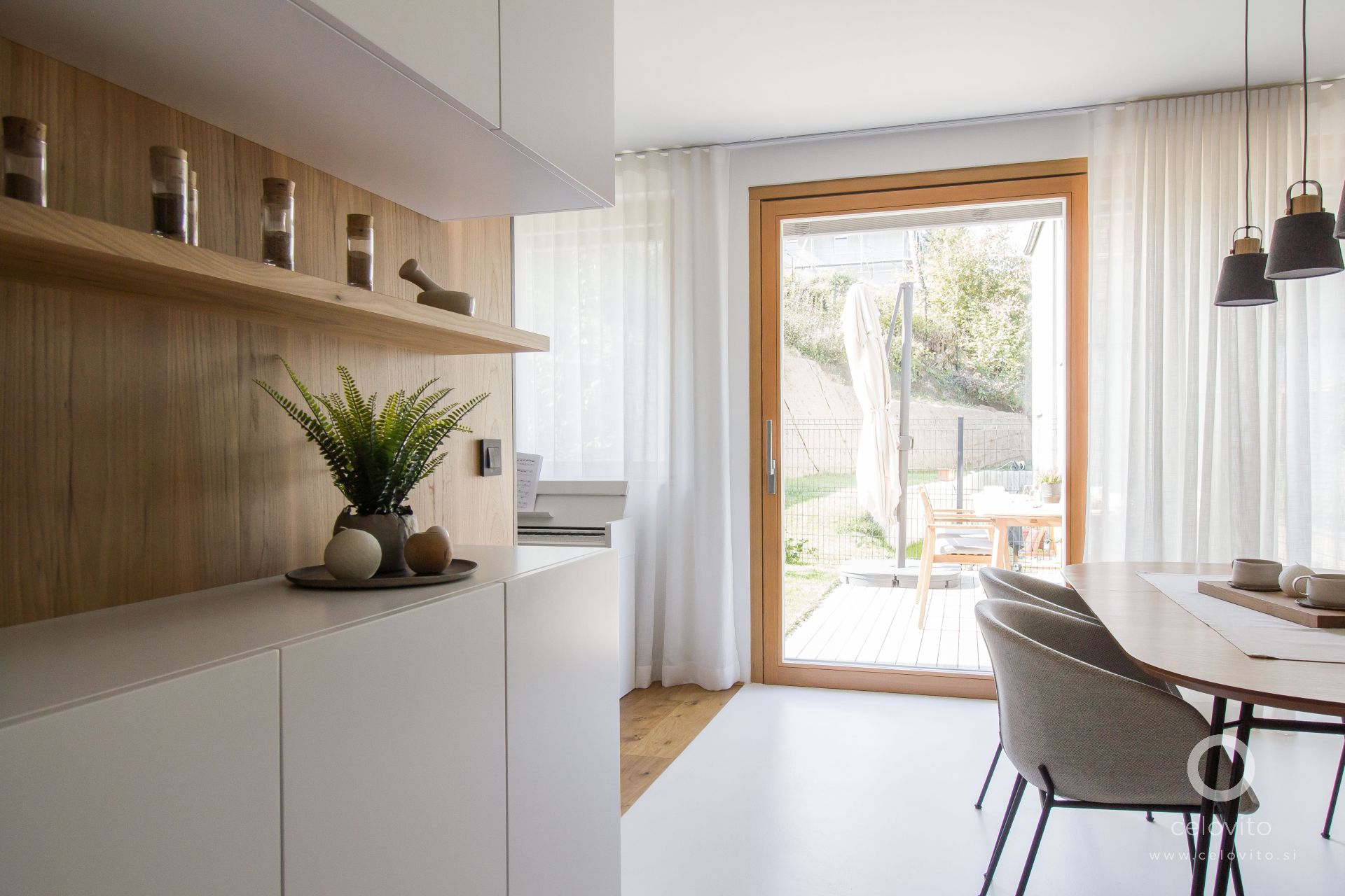 Hodnik nas mimo kopalnice in utilitija vabi v dnevne prostore. Največja sprememba v tlorisu se je zgodila z zamenjavo dnevnega prostora in kuhinje. Kuhinja z jedilnico je zdaj na mestu, kjer je bila predvidena dnevna soba, kar je prineslo veliko prednosti. Prostor je zdaj bolj funkcionalen. Kuhinja, ki predstavlja srce doma, je zdaj prostornejša ter deluje toplo in prijetno. Na kuhinjskih elementih prevladuje les v naravnem odtenku, bele zgornje fronte pa naravnim tonom dodajajo kontrast. Tla iz cementnega microtoppinga dopolnjujejo sodoben videz in prefinjenost.