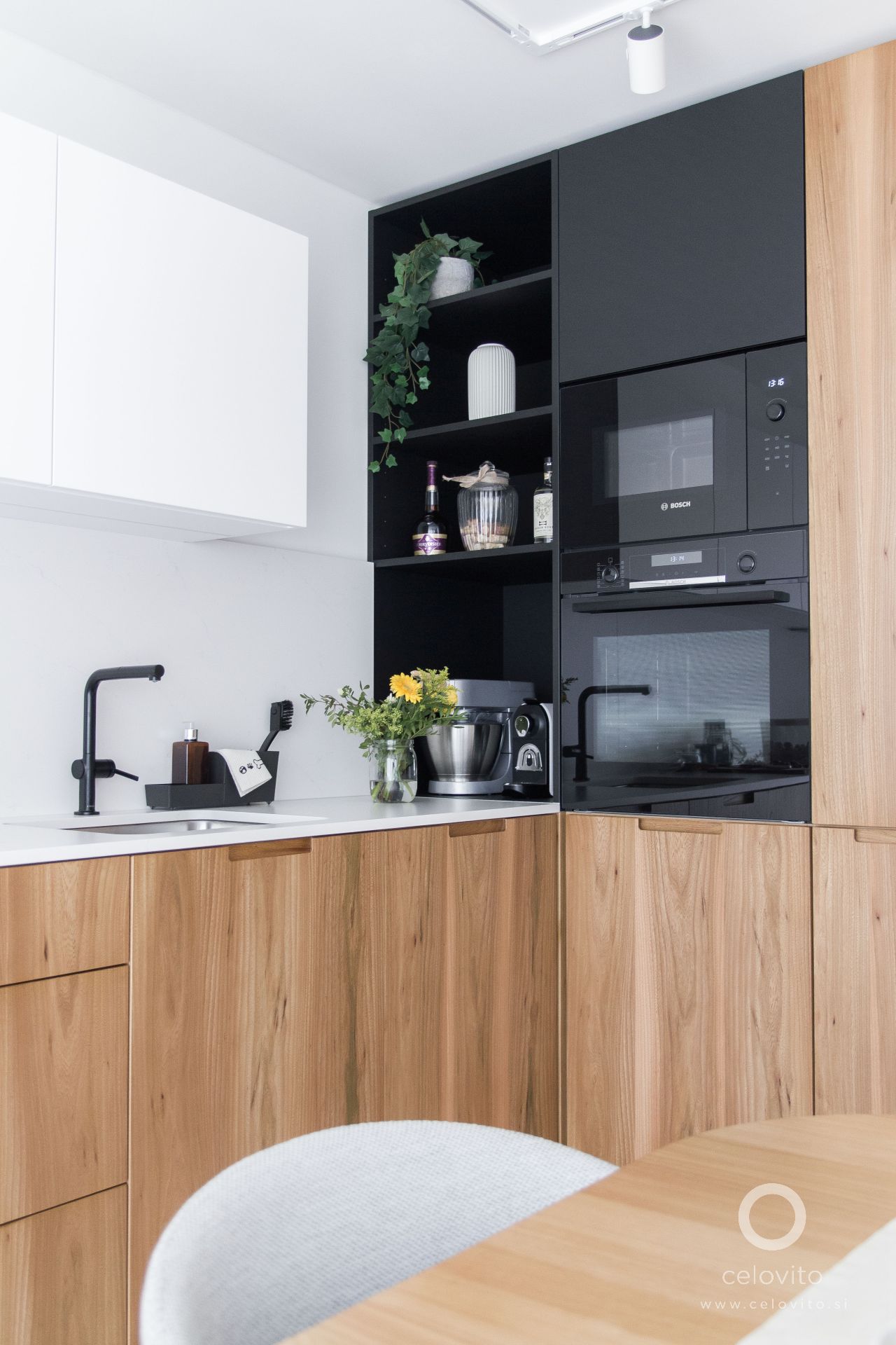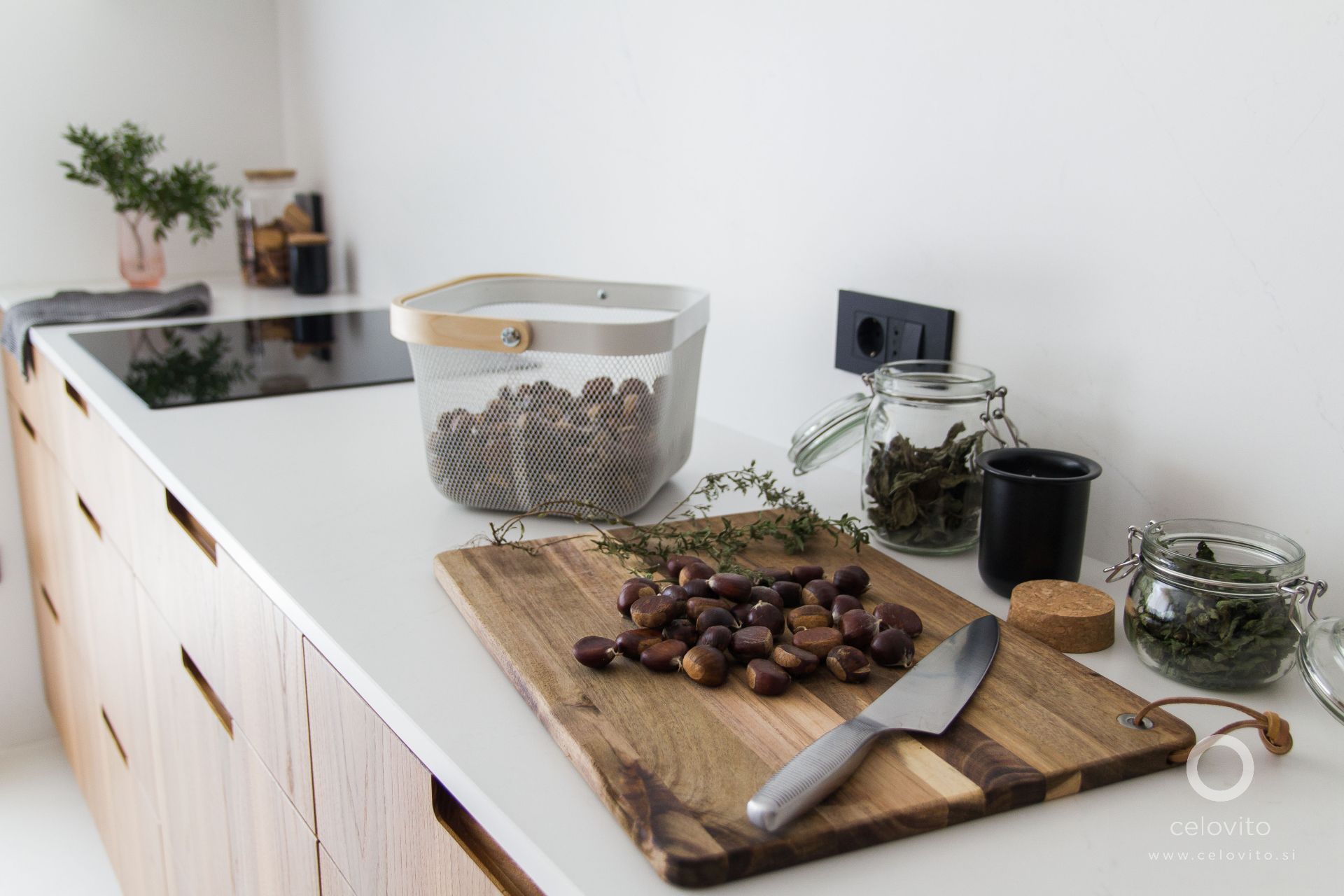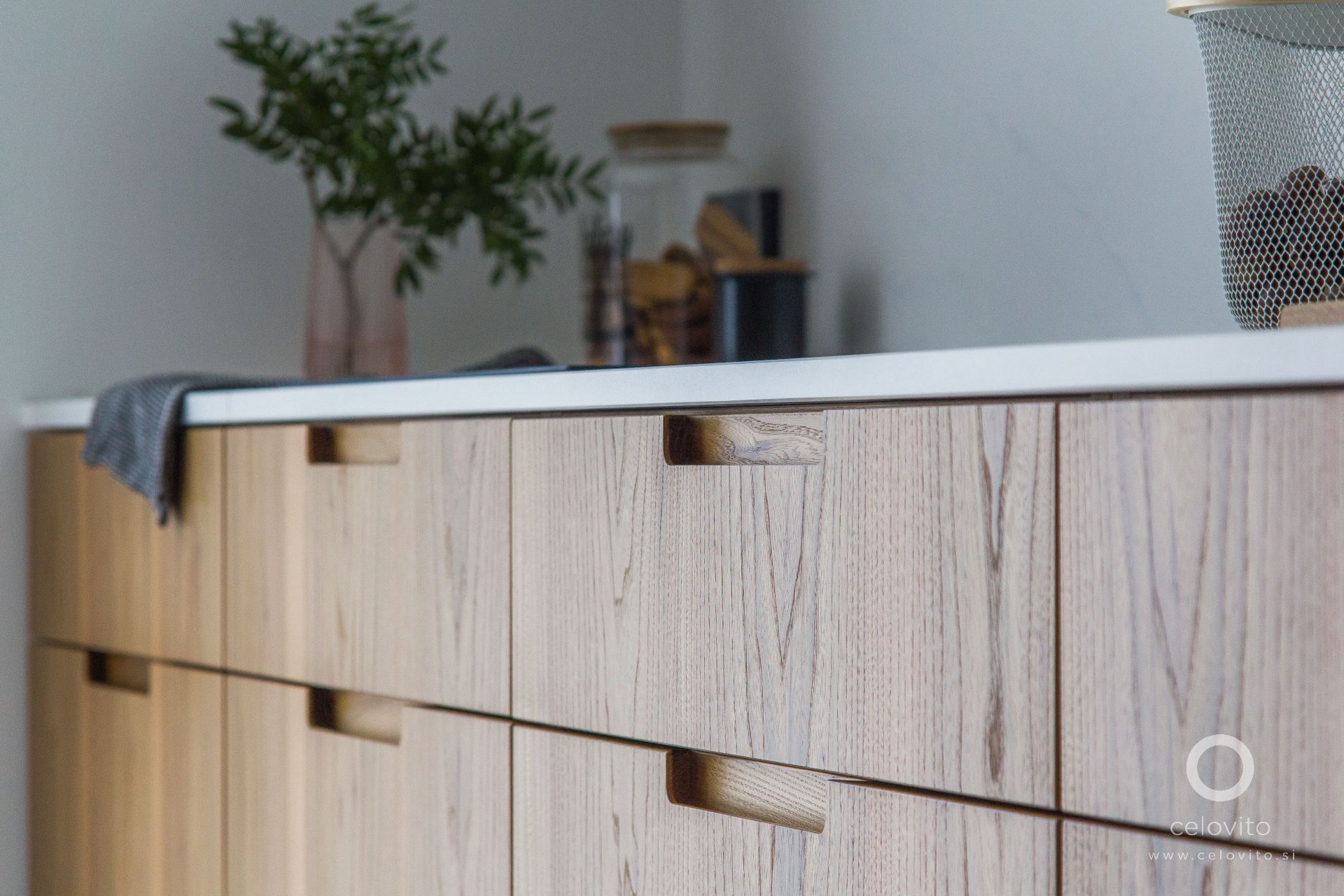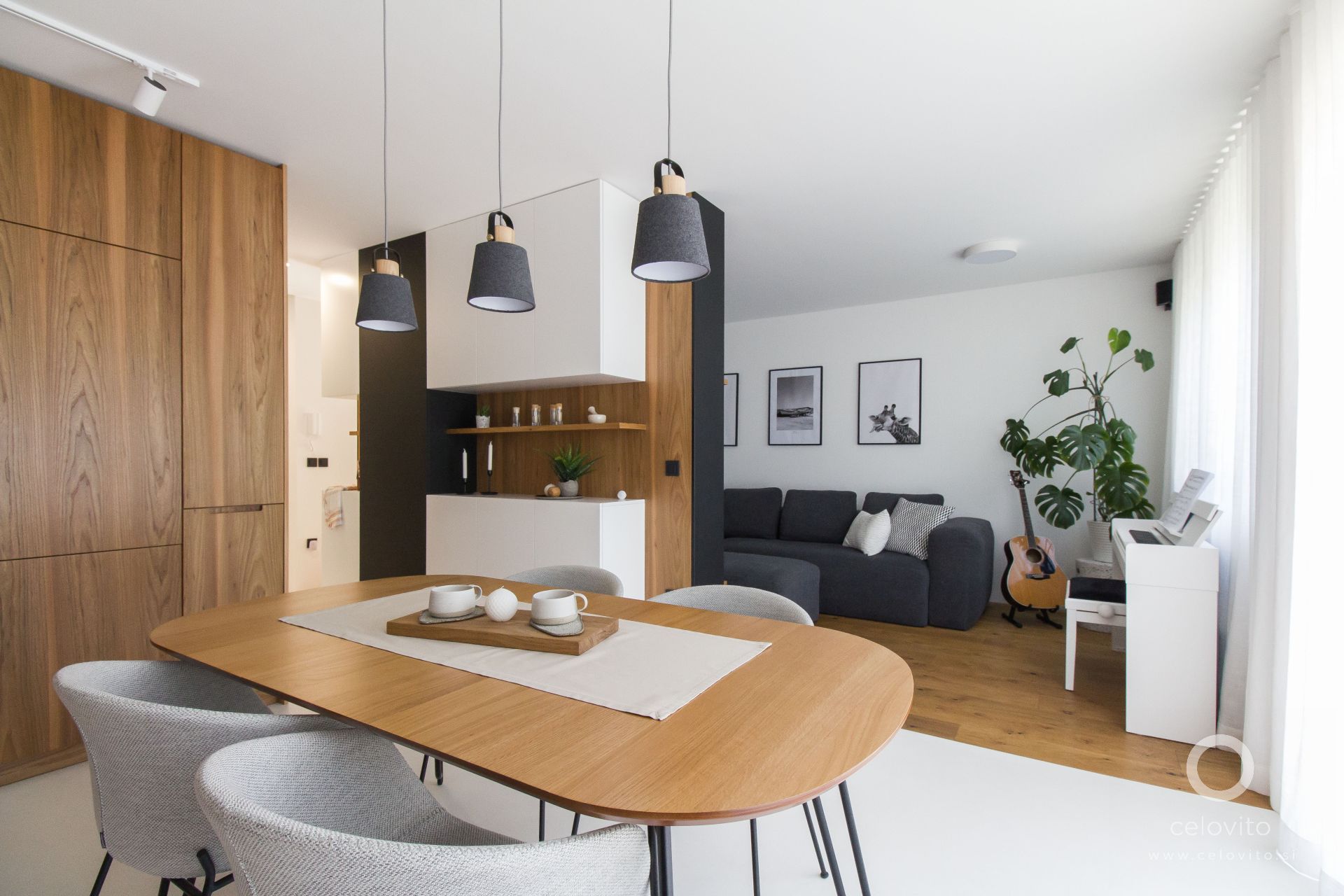 Hodnik nas mimo kopalnice in utilitija vabi v dnevne prostore. Največja sprememba v tlorisu se je zgodila z zamenjavo dnevnega prostora in kuhinje. Kuhinja z jedilnico je zdaj na mestu, kjer je bila predvidena dnevna soba, kar je prineslo veliko prednosti. Prostor je zdaj bolj funkcionalen. Kuhinja, ki predstavlja srce doma, je zdaj prostornejša ter deluje toplo in prijetno. Na kuhinjskih elementih prevladuje les v naravnem odtenku, bele zgornje fronte pa naravnim tonom dodajajo kontrast. Tla iz cementnega microtoppinga dopolnjujejo sodoben videz in prefinjenost.