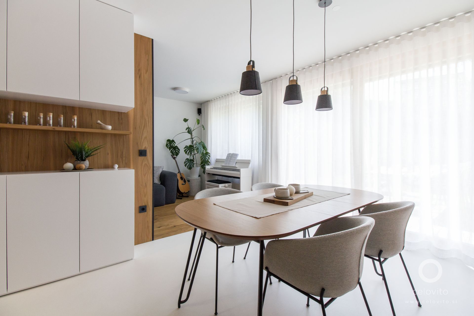 Jedilnico krasi velika miza z zaobljenimi robovi, ki omogočajo bolj tekoče prehajanje po prostoru. Noge mize in stolov so tanke – kovinske, da elementi delujejo lahkotnejši in v globino prostora prepuščajo več svetlobe.