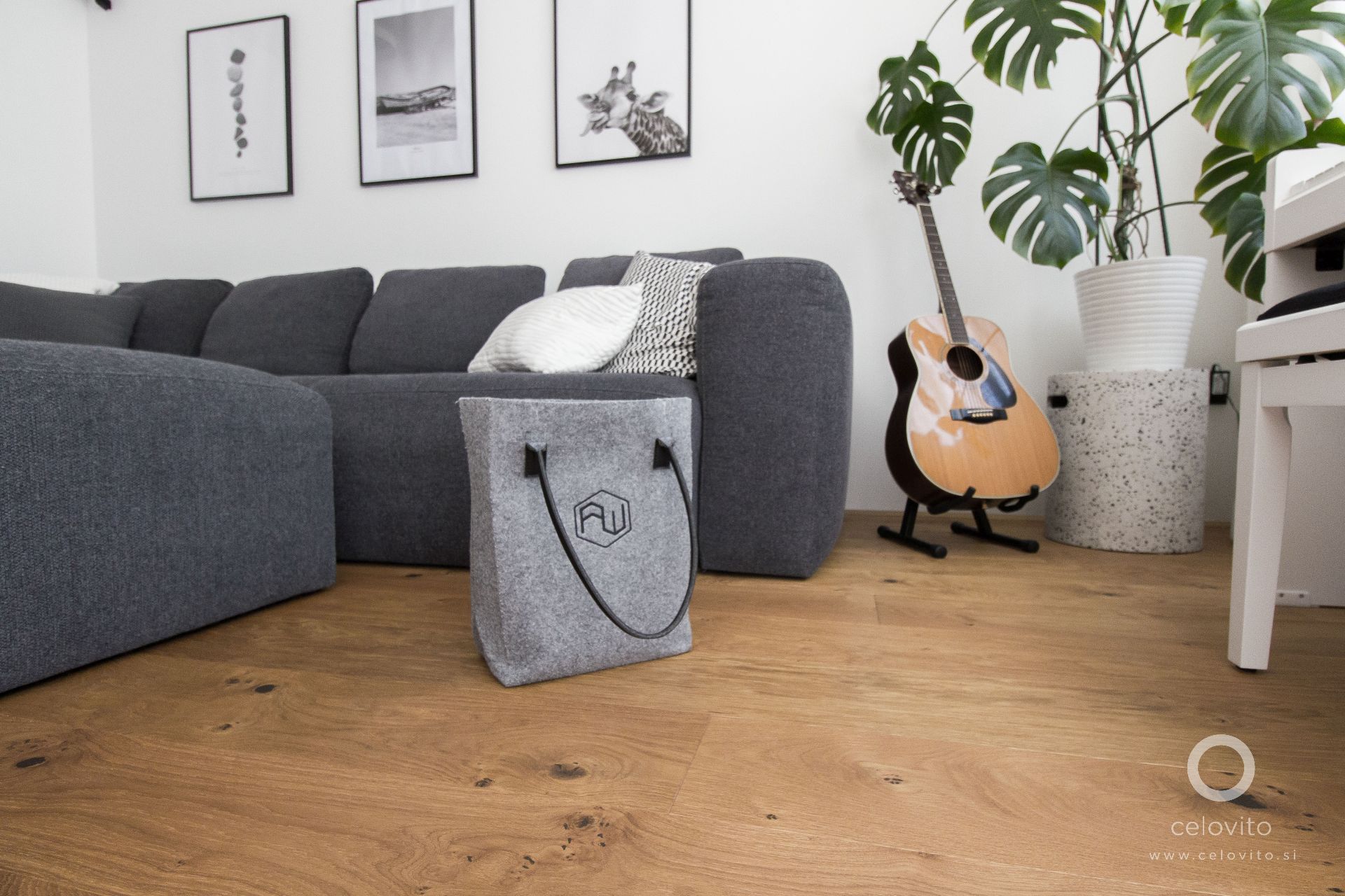 Dnevno sobo in jedilnico razmejujeta različni talni oblogi. V dnevni sobi kraljuje hrastov parket, kar daje prostoru občutek naravne topline in prijetnosti. V jedilnici je položen odpornejši in za čiščenje manj občutljiv microtopping.