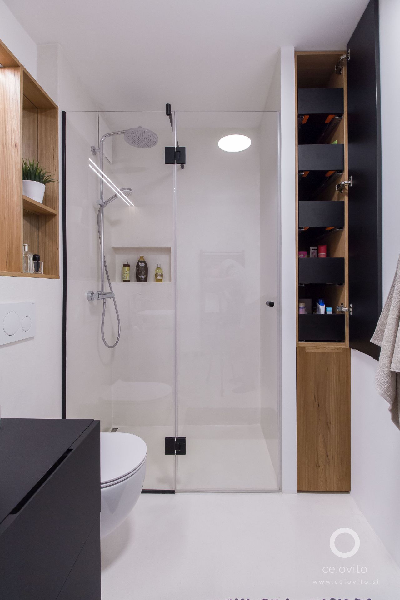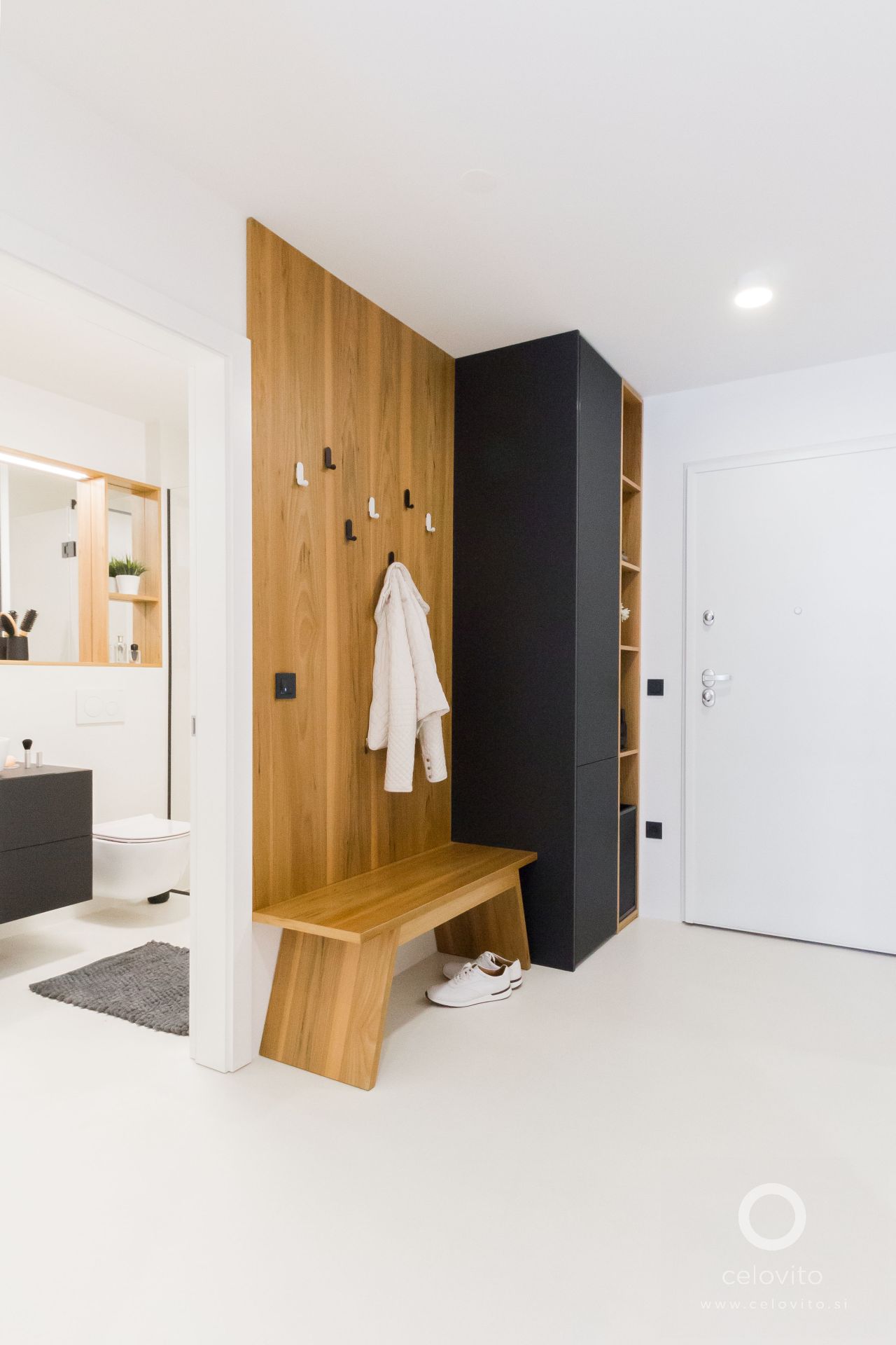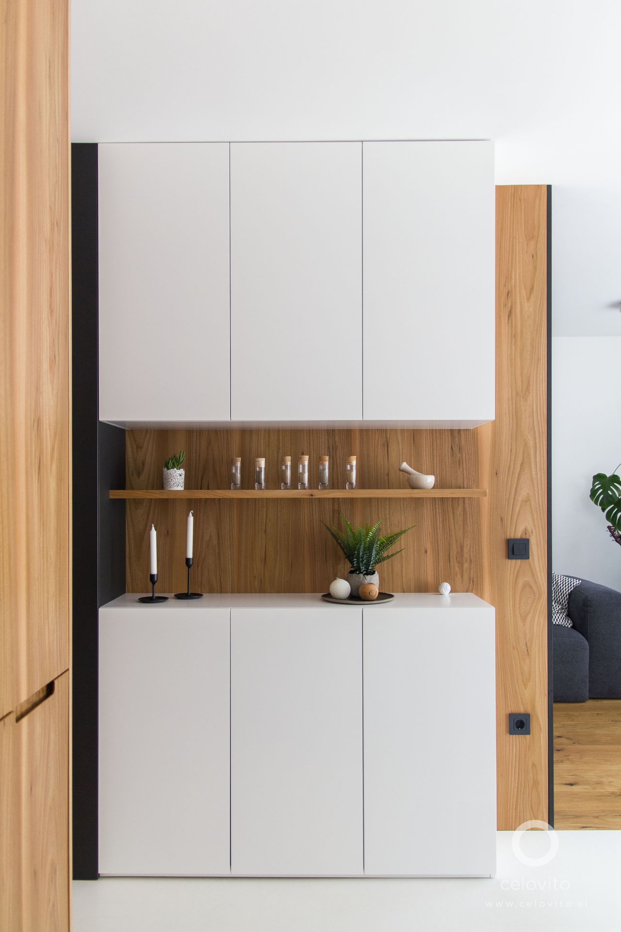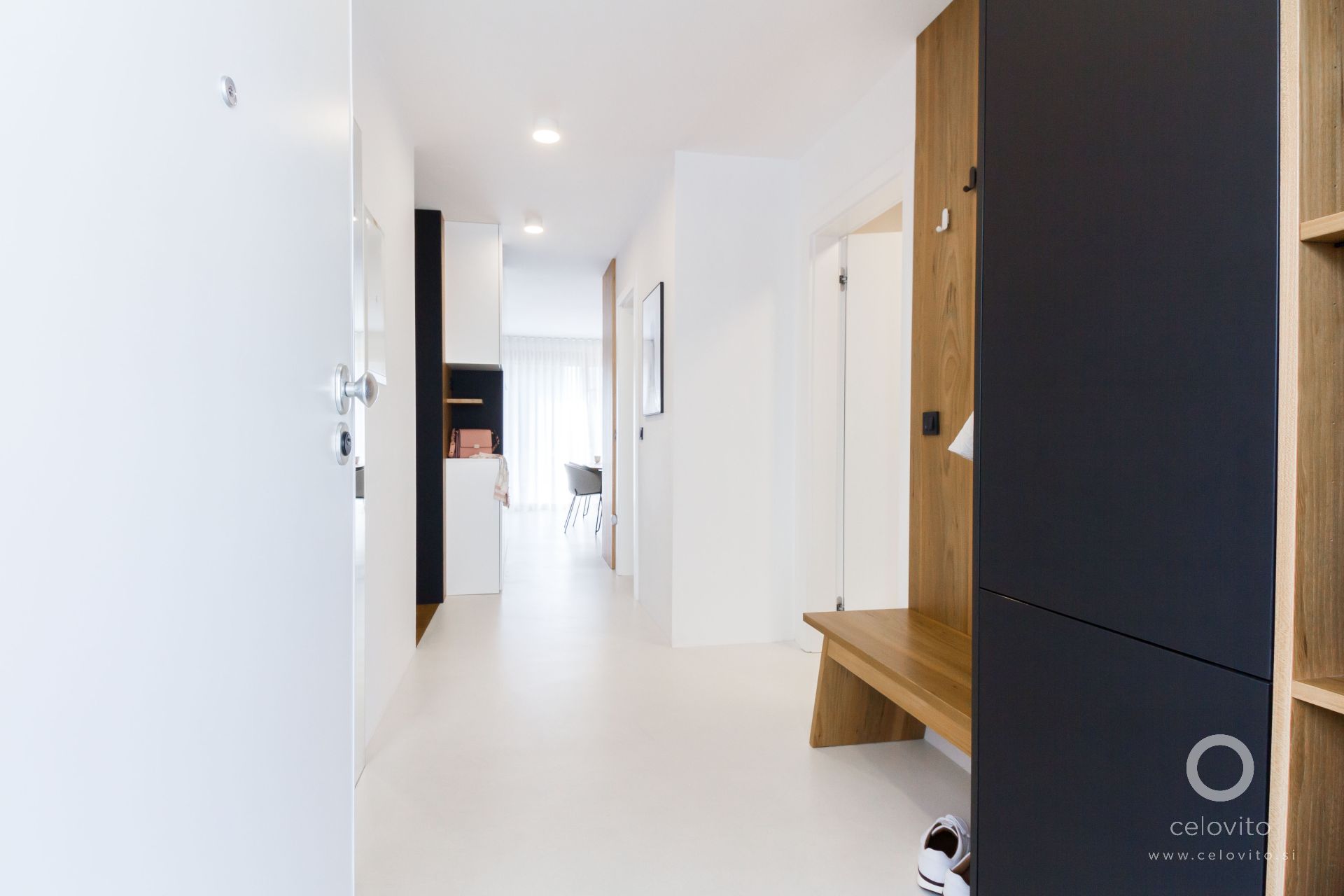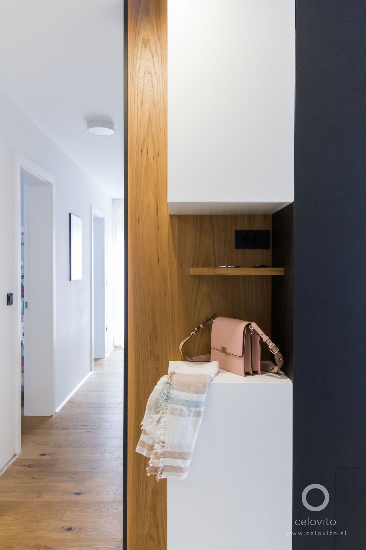 “Pri tlorisu nam je bilo pomembno, da deluje odprto, prehodno. V predsobi smo odstranili vrata, saj vetrolov v stanovanju zaradi zaprtja skupnega stopnišča ni bil več potreben. S tem smo pridobili dovolj prostora za neprekinjen sestav iz polic, zaprte omare, površino za sedenje in dovolj prostora za obešanje jaken. Da smo še malo povečali predprostor, smo prestavili vrata v kopalnico.”, sta povedala.
