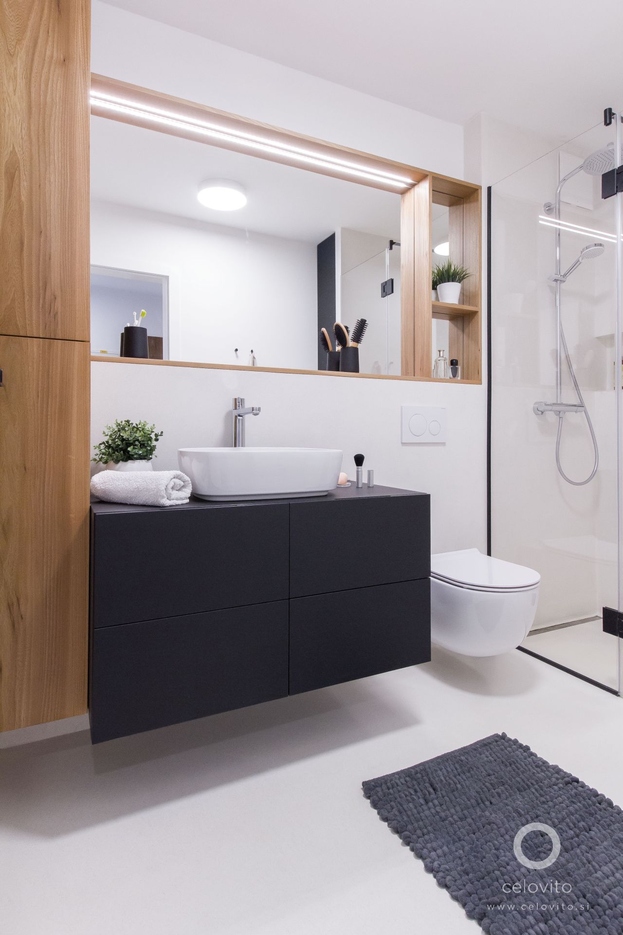 Tudi kopalniški prostori so doživeli popolno prenovo. Kopalnico sta sicer malenkost zmanjšala (na račun povečanja hodnika), zato pa v kopalnici prevladuje veliko ogledalo, ki prostor optično poveča. Elementi so dvignjeni od tal, da ne pridejo v stik z vlago, hkrati pa je s tem poenostavljeno tudi čiščenje. Izstopa še ozek, globok in do stropa segajoč predalnik, umeščen v nišo desno od tuš kabine.