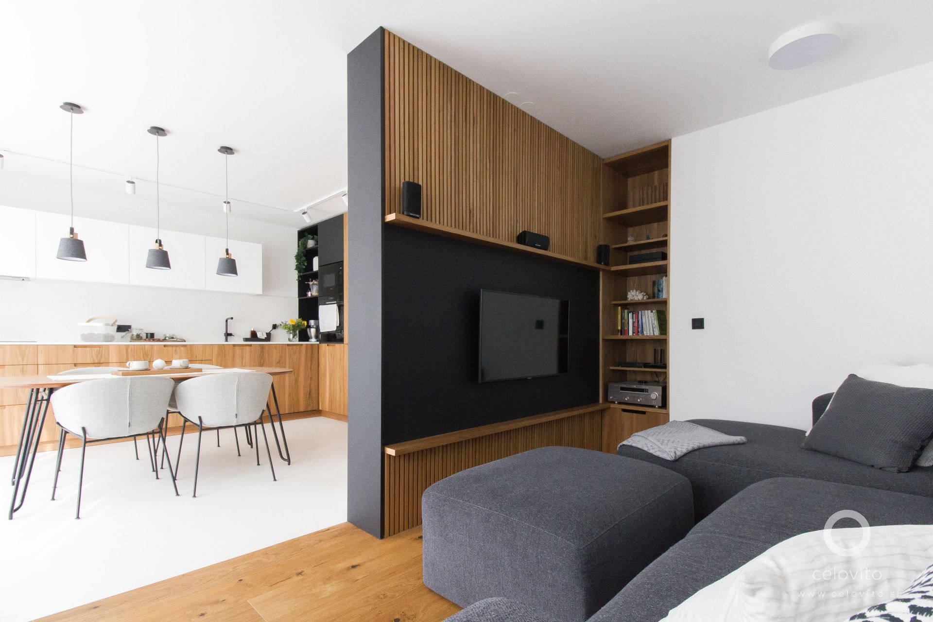 Drug pomemben element ločitve prostora v dnevni sobi je stena, ki omogoča intimnejše preživljanje prostega časa na kavču ob branju knjige ali ogledu najljubše serije na televiziji. Temnejši odtenki in prostorsko ozvočanje TV kotička ustvarijo prijeten kino ambient.