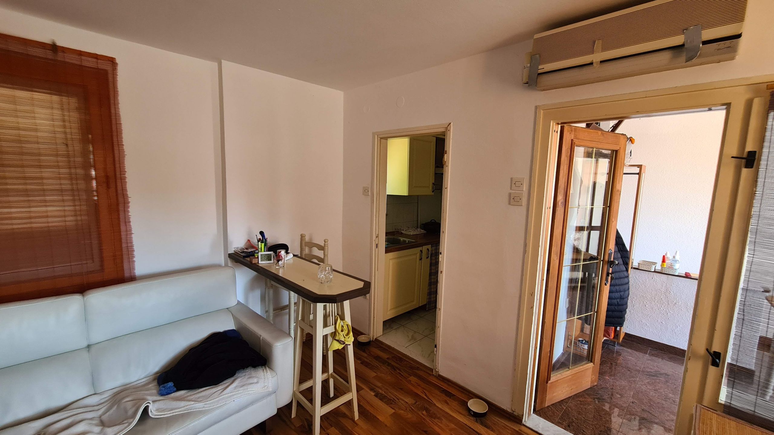 Iz zmanjšanega predprostora vstopimo direktno v lepo osvetljeno kuhinjo z dvema nizoma, na drugo stran prostora pa smo umestili dnevno sobo s kavčem in TV regalom. Piko na i doda še malo posebno ogledalo, ki prostor optično poveča.