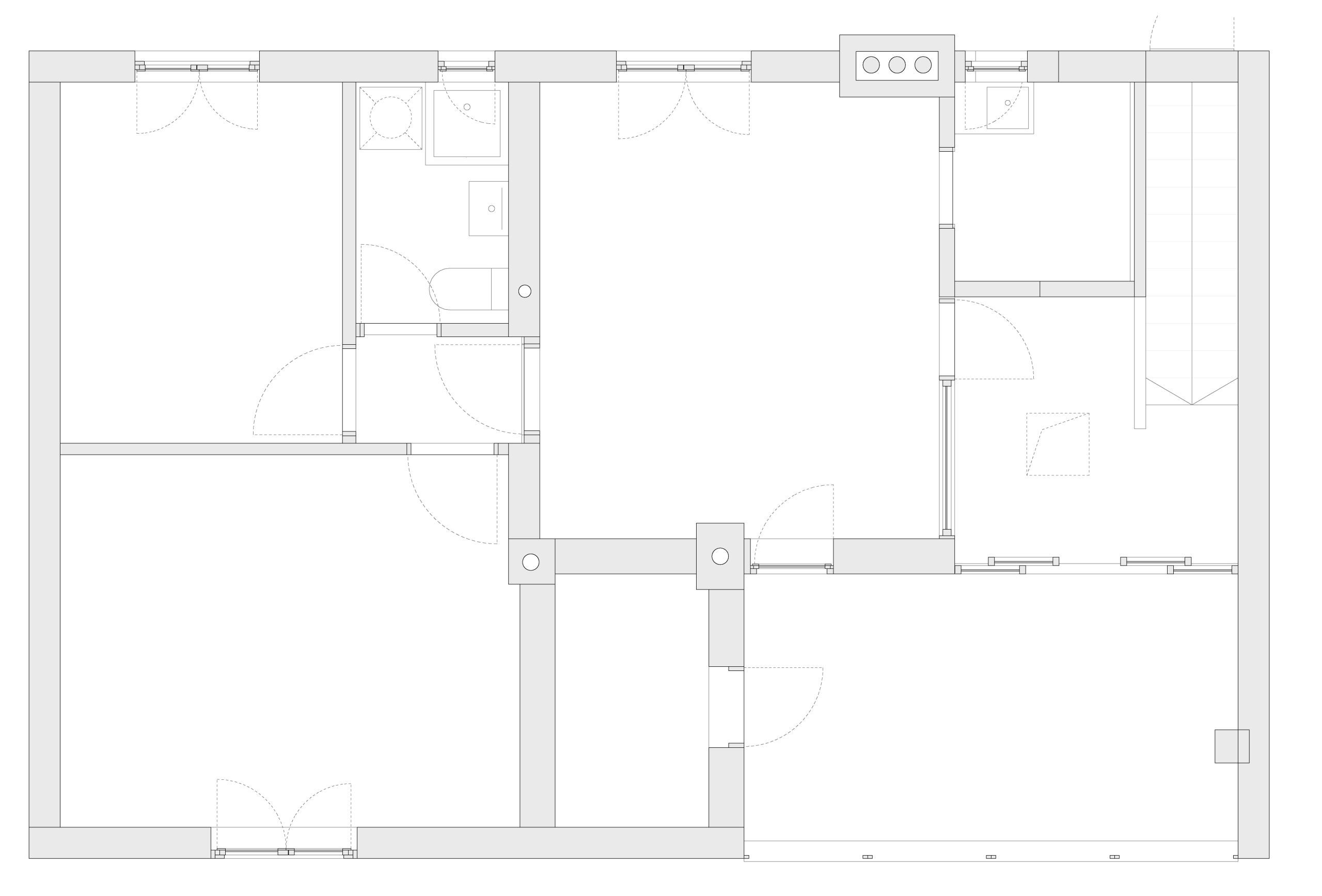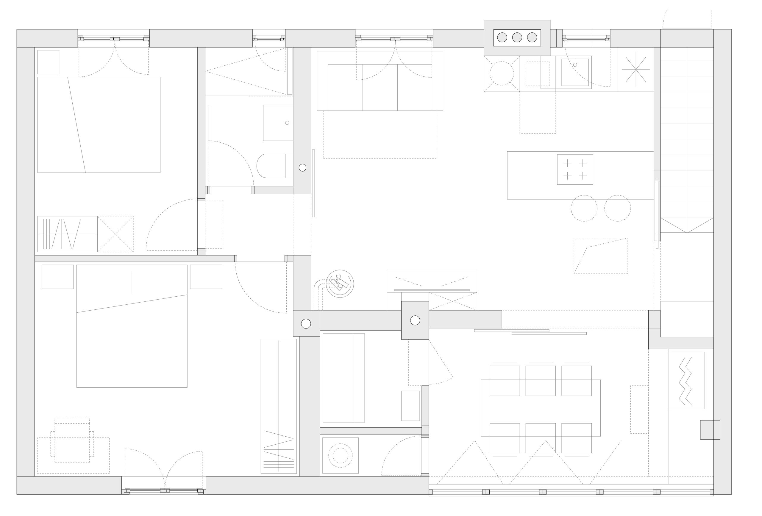 Do največje spremembe je prišlo pri vhodu v stanovanje. Iz predprostora, manjše kamrice in dnevne sobe smo naredili en večji odprt dnevni prostor. To smo dosegli z rušitvijo predelnih sten.