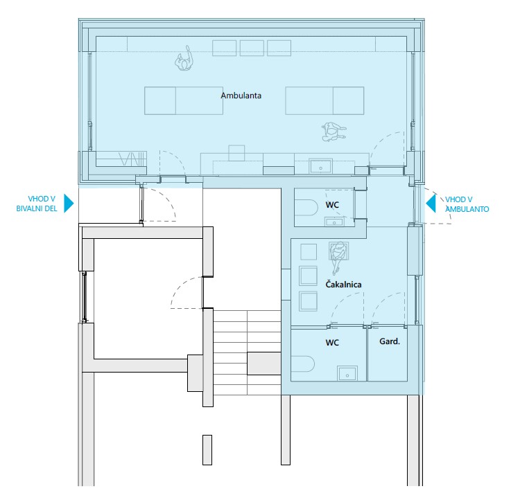 Lastnik hiše se je na nas obrnil z željo, da razširimo njegovo fizioterapevtsko ambulanto. Začel je z manjšim prostorom v hiši, ki pa je z rastjo prakse postal premajhen. Prav tako ga je motilo, da je imela ambulanta skupni vhod s stanovanjskim delom hiše. Naš cilj je bil pridobiti ločeno enoto.