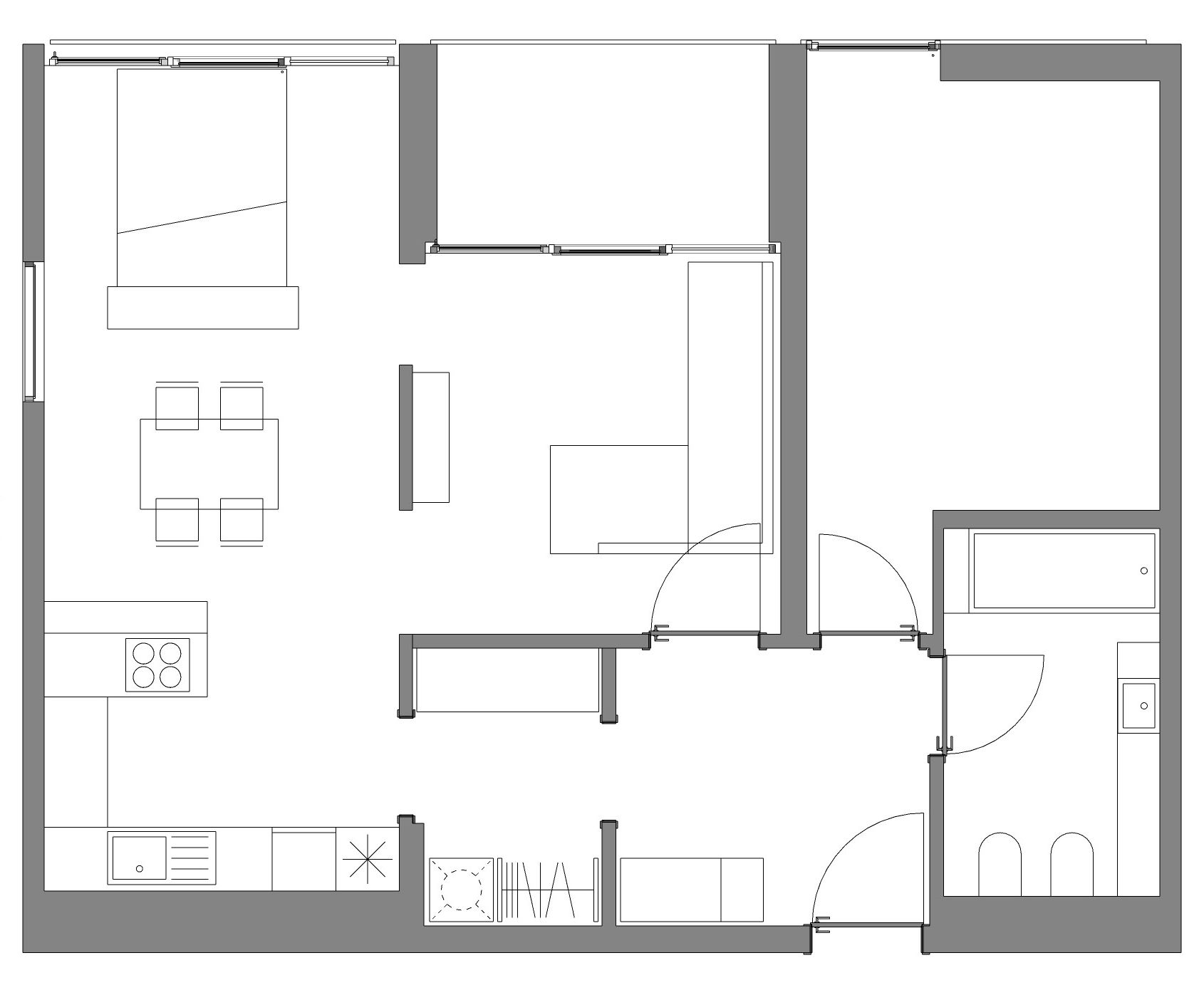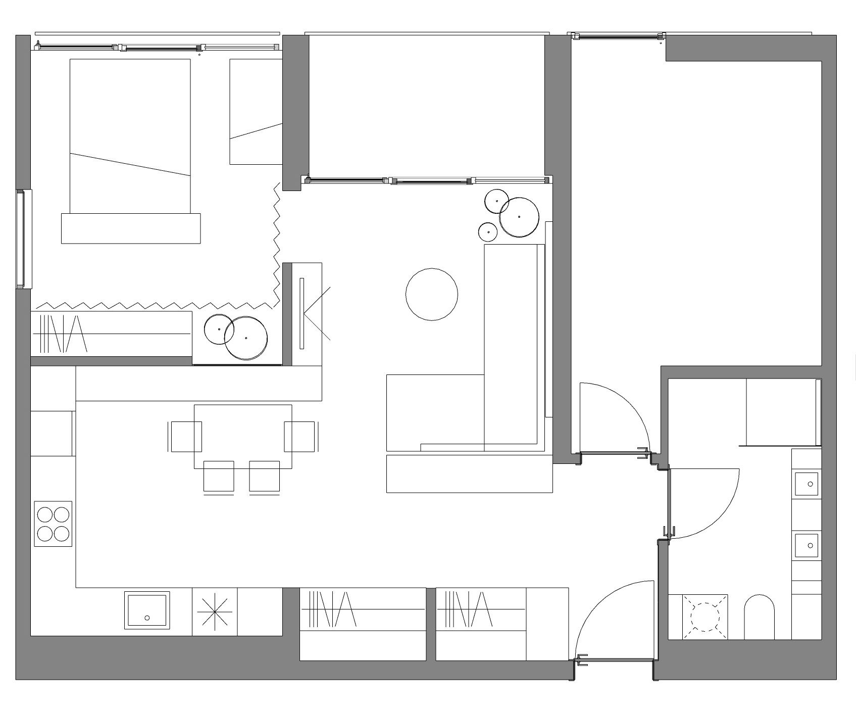 Največji problem, ki smo ga prepoznali v stanovanju je bil utiliti, skozi katerega je vodil prehod v kuhinjo. Ta je bil popolnoma drugačnega značaja kot ostalo stanovanje, obenem pa je popolnoma razdelil osrednji prostor na kuhinjo z jedilnico in ločeno dnevno sobo. Ker so si naročniki želeli ta dva prostora čim bolj združiti, smo utiliti nadomestili z velikimi, globokimi omarami, kjer je zelo veliko prostora za shranjevanje. Dnevno sobo smo delno pregradili z visokim nizom omar z nišami, do katere se lahko dostopa iz obeh smeri. Ta preprečuje obiskovalcem pogled v zasebnost stanovalcev iz smeri vhodnih vrat, hkrati pa je zaradi transparentnosti še vedno občutiti enotnost prostora. Pralni in sušilni stroj smo prestavili v omaro v kopalnici na mesto, kjer je bil prej bide. Kuhinja se nadaljuje z nizom visokih belih omar tako, da se prehod med hodnikom in kuhinjo popolnoma zabriše in se prostor zlije v celoto.